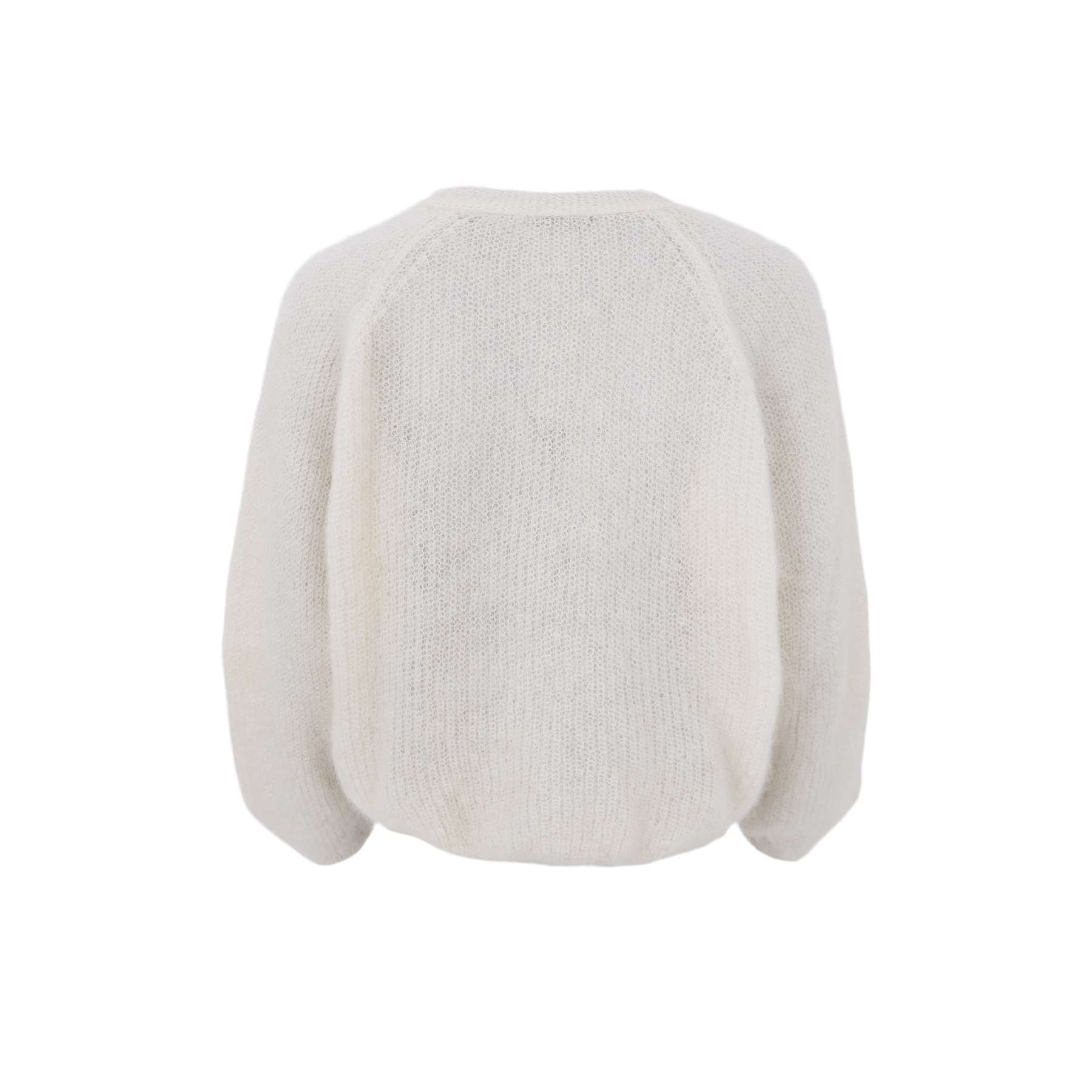 Raglan strikket genser i mohair med knyting i front. Genseren er i størrelsen S/M.