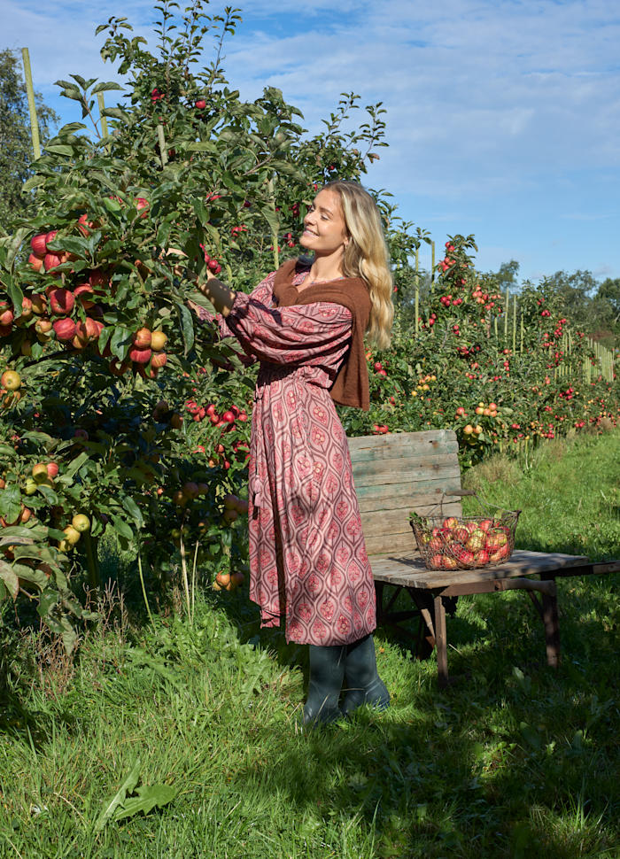 Kjolen har V-utringning, lange armer og justerbar knyting i midjen for perfekt passform.