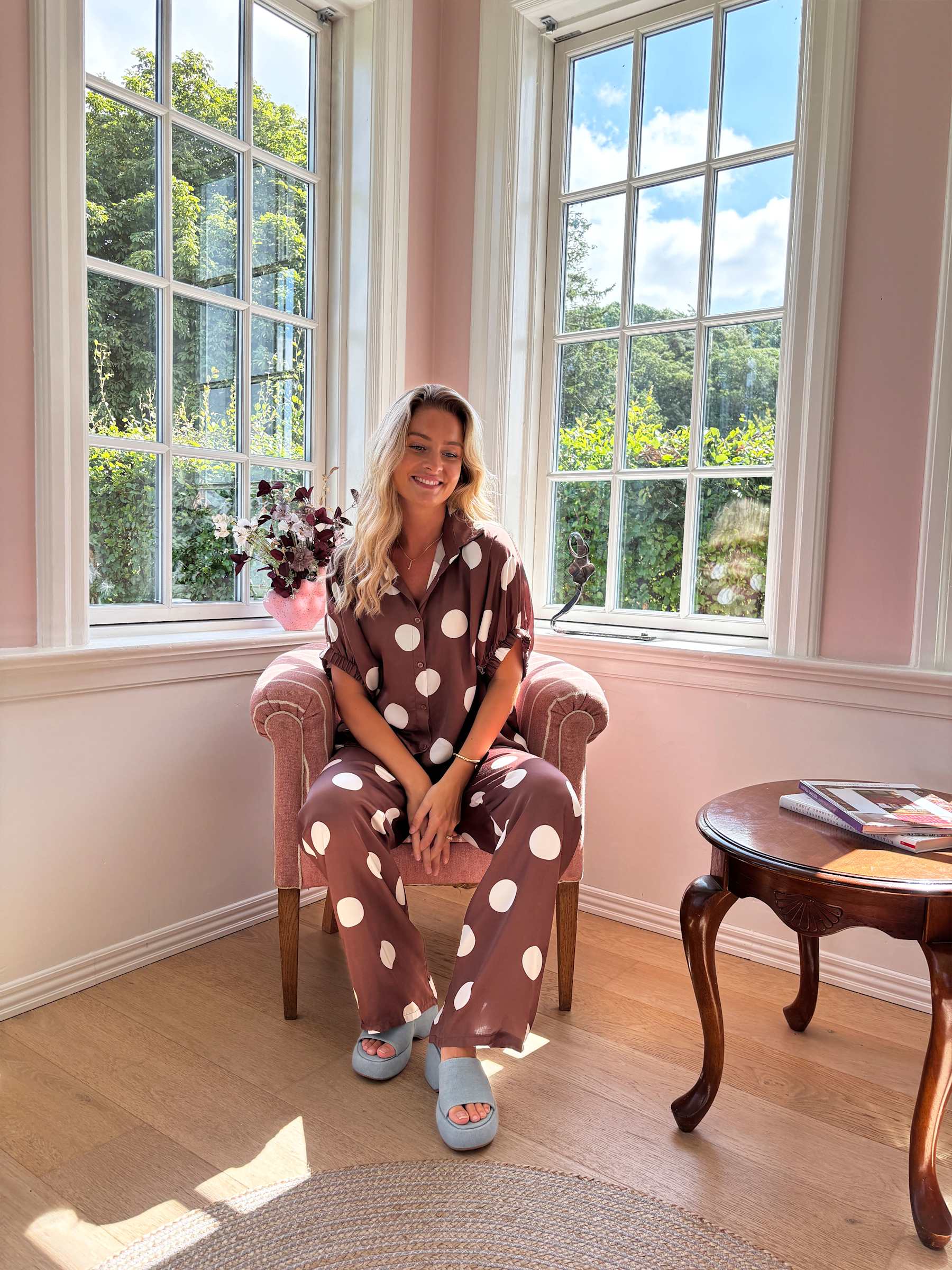 Frisk opp garderoben med denne lekne og elegante skjorteblusen i viskose-sateng. Blusen er i størrelse one size og har et oversized uttrykk med store hvite prikker på brun bunn, som gir et moderne og trendy preg. Den er lett og behagelig å ha på, med en myk og luksuriøs følelse mot huden.
