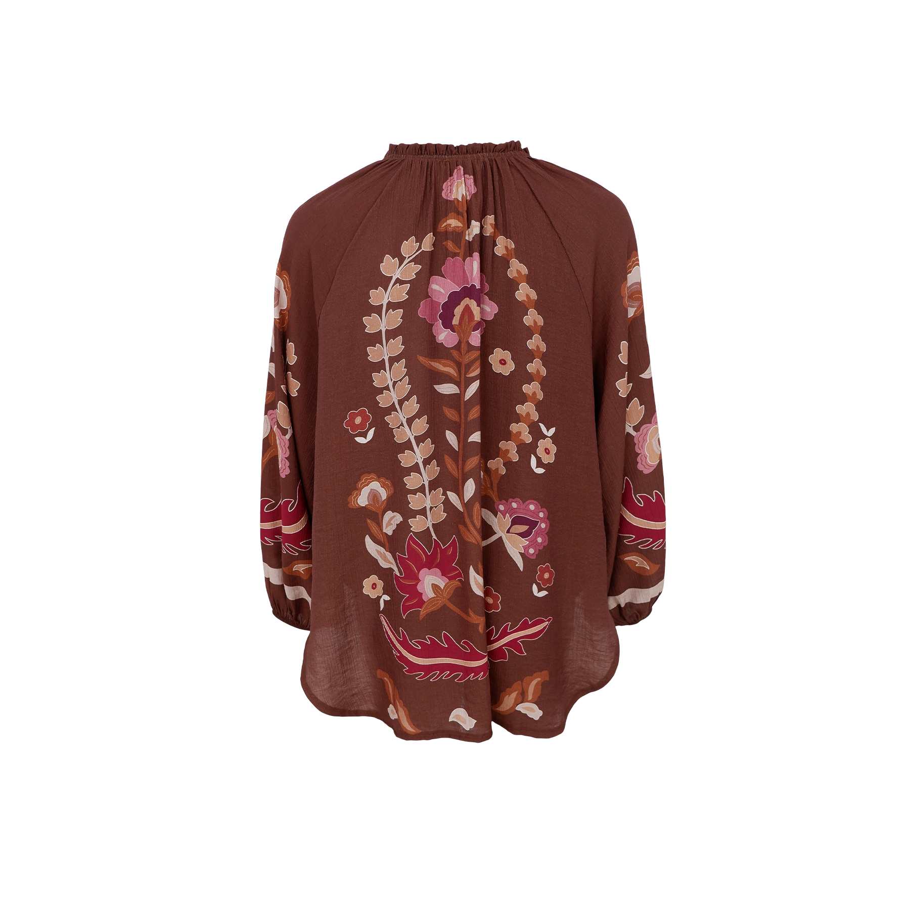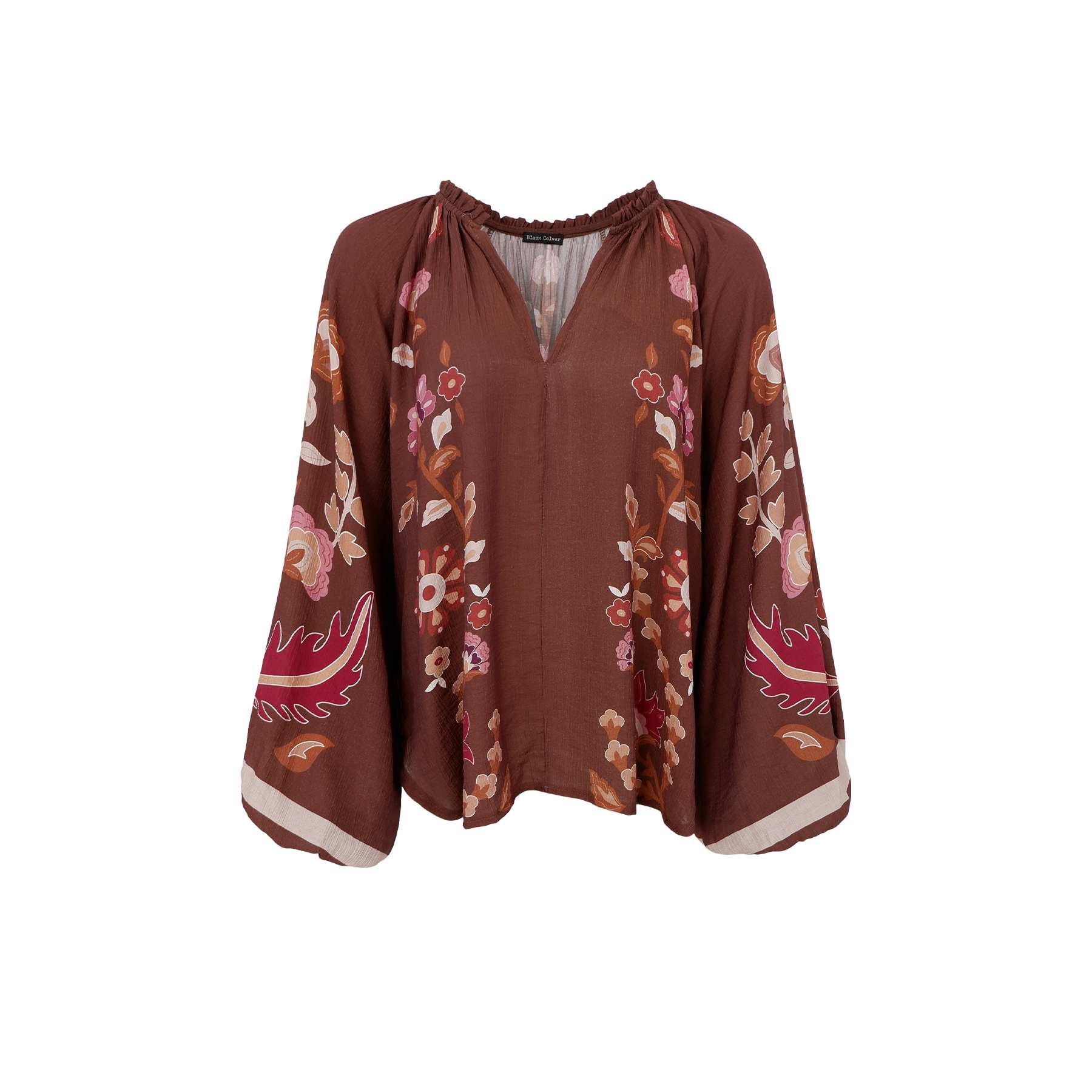 Lekker oversized bluse med blomsterprint og brun bakgrunn. Blusen er i størrelse one size.