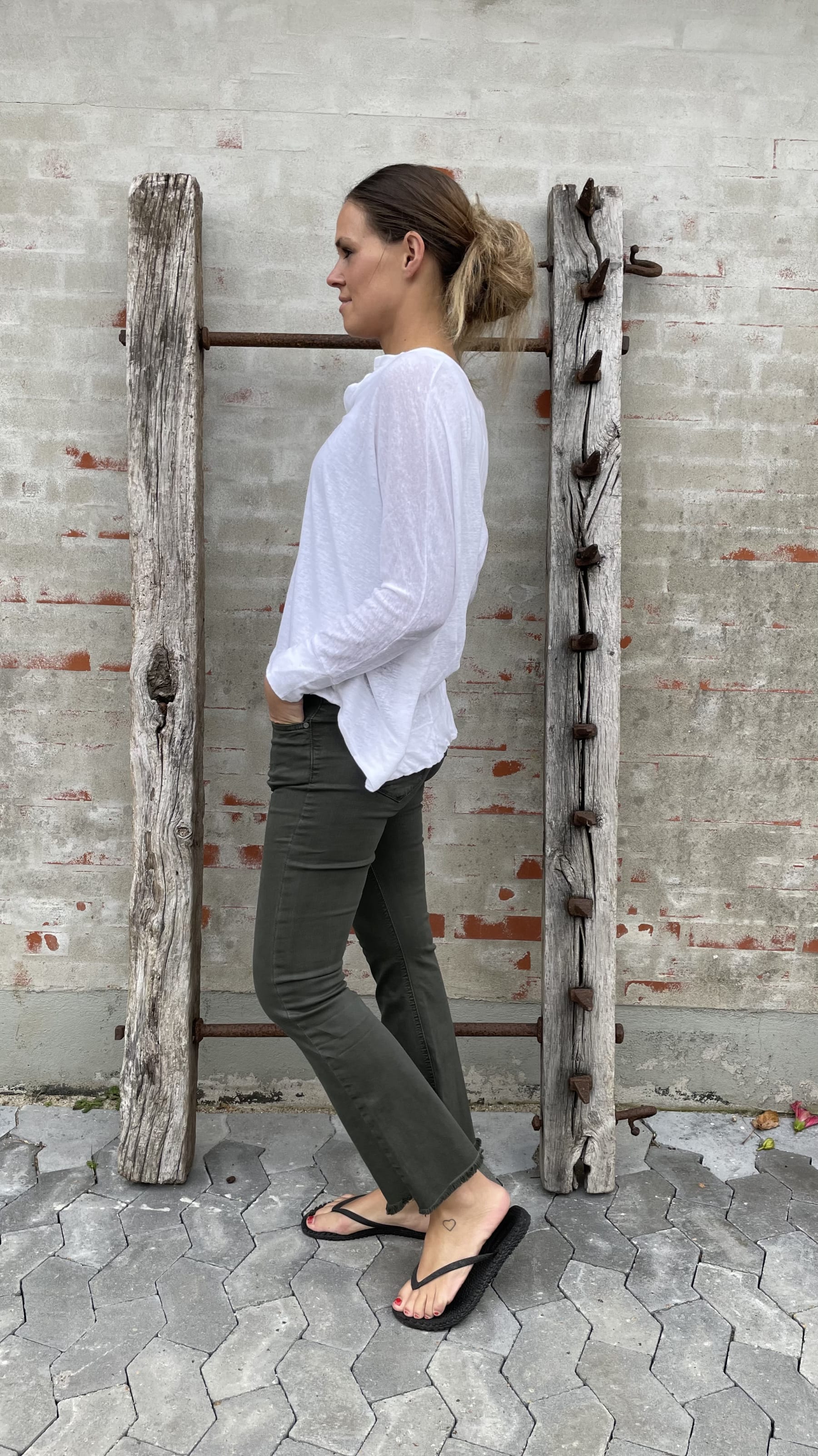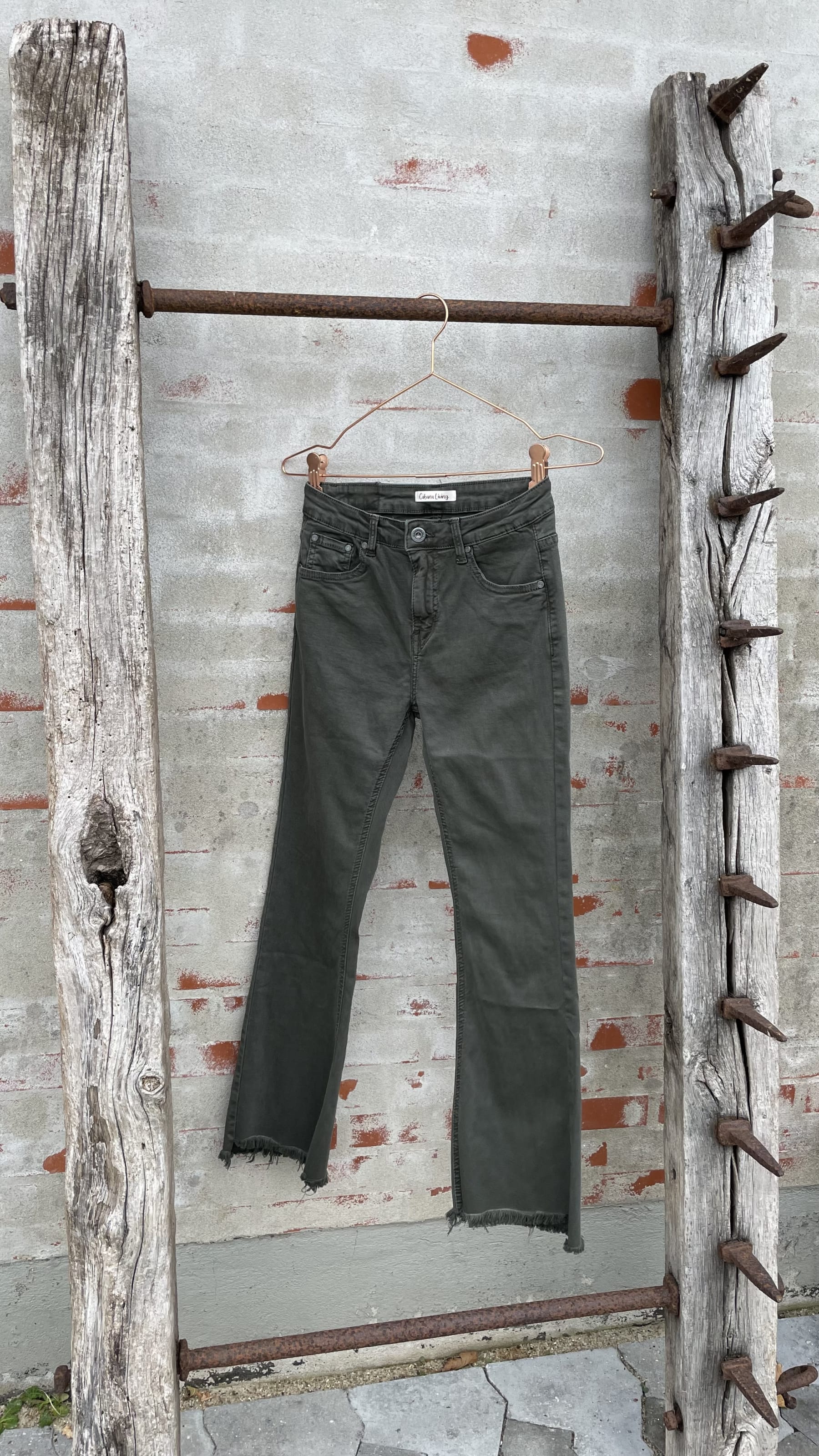 Bootcut jeans med 5 lommer og frynser nederst på bena. 7/8 dels lengde på bena.