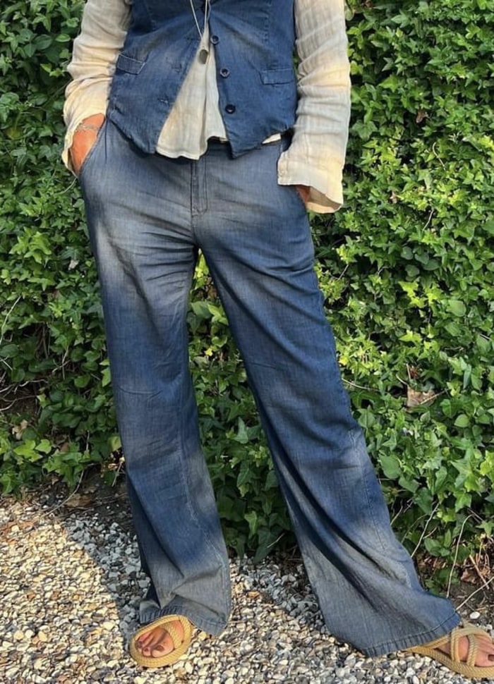 Chino bukse med rette ben og elastik bak på linning og i tynn chambrey denim
