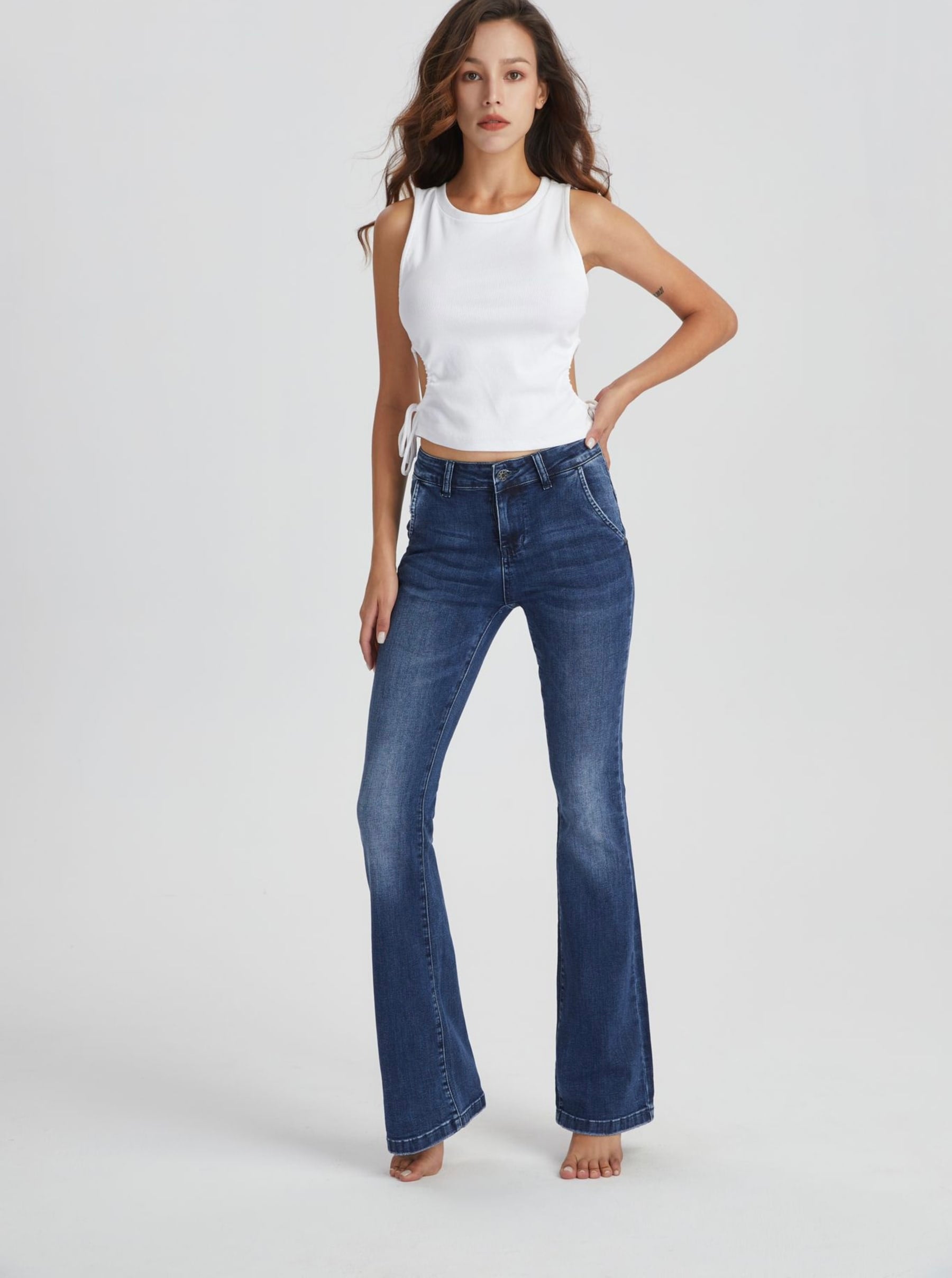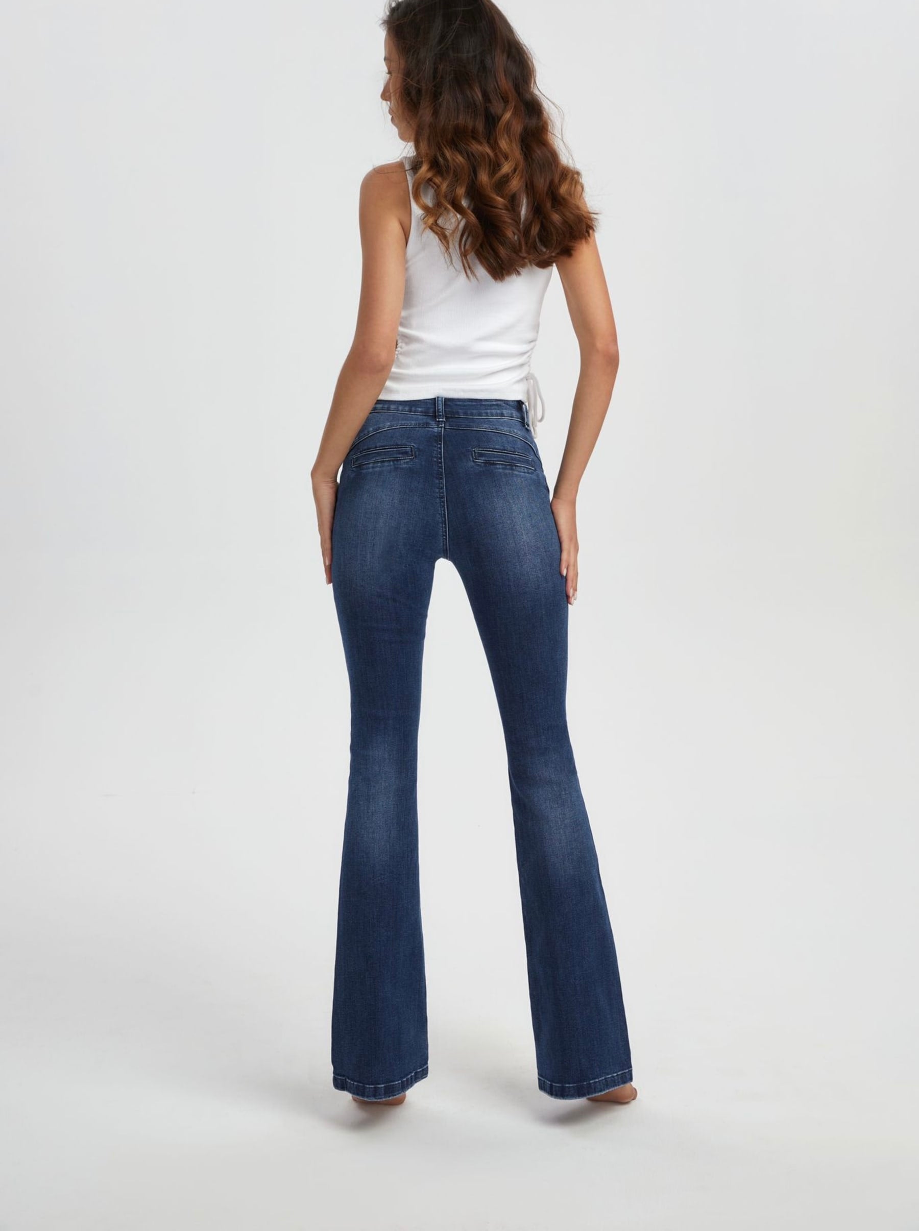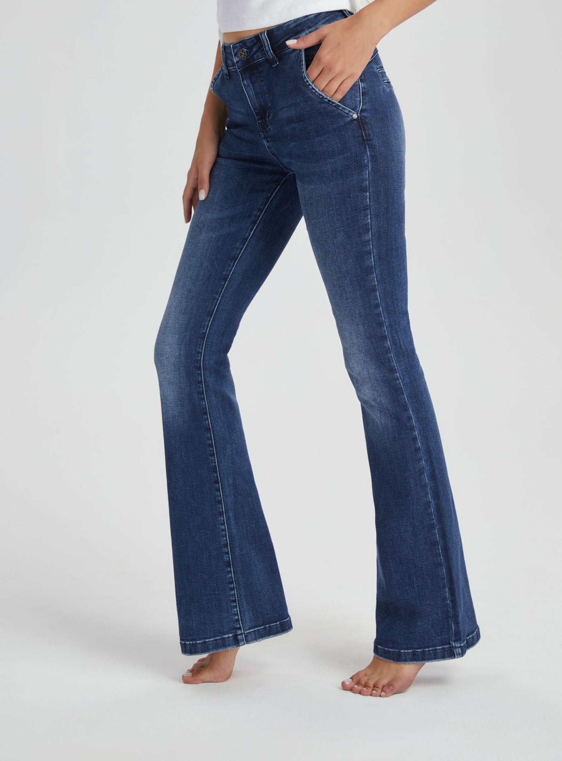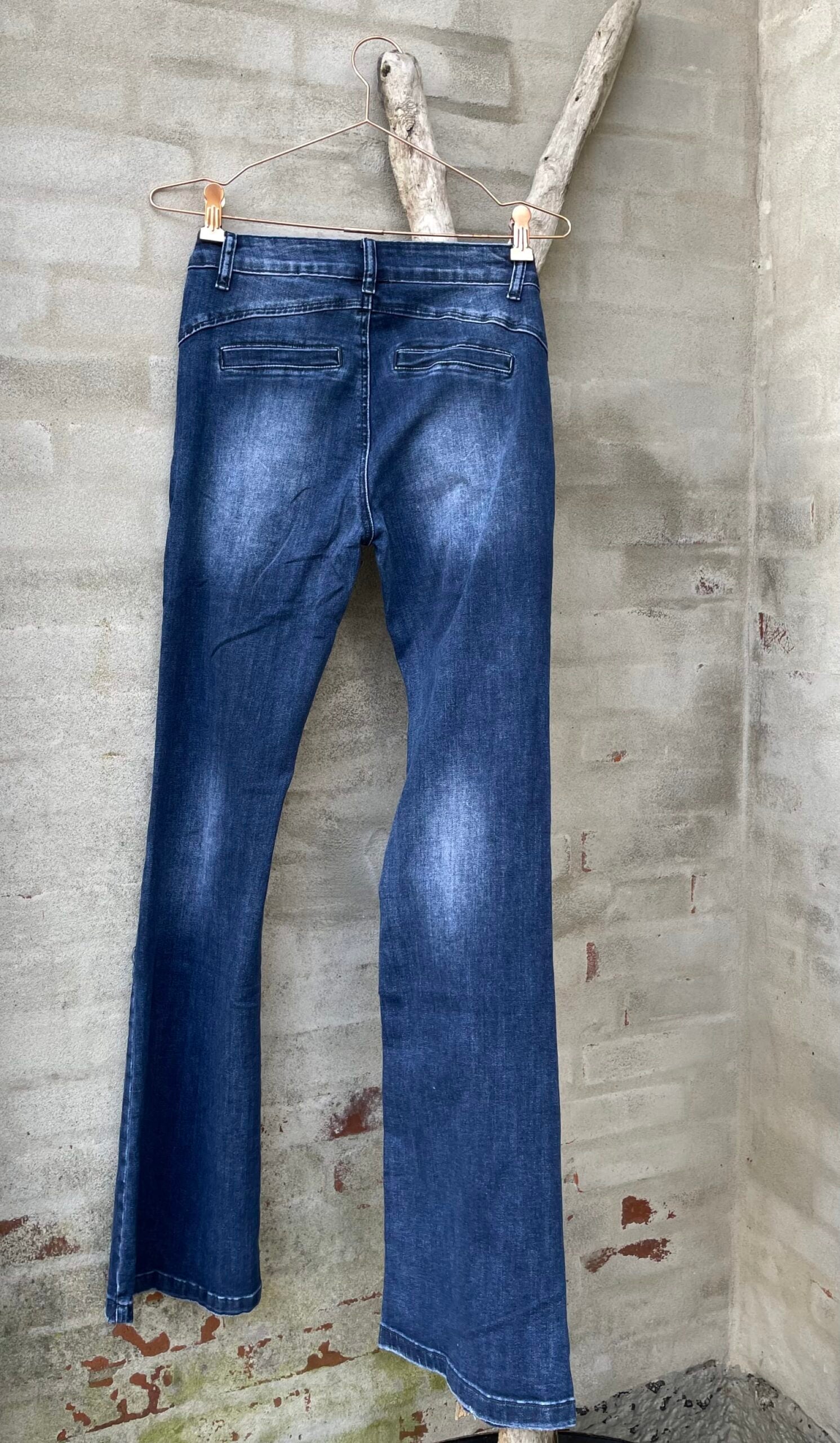 Lekker flare jeans med lange ben i dark blue denim. Buksen er mid-rise på livet.