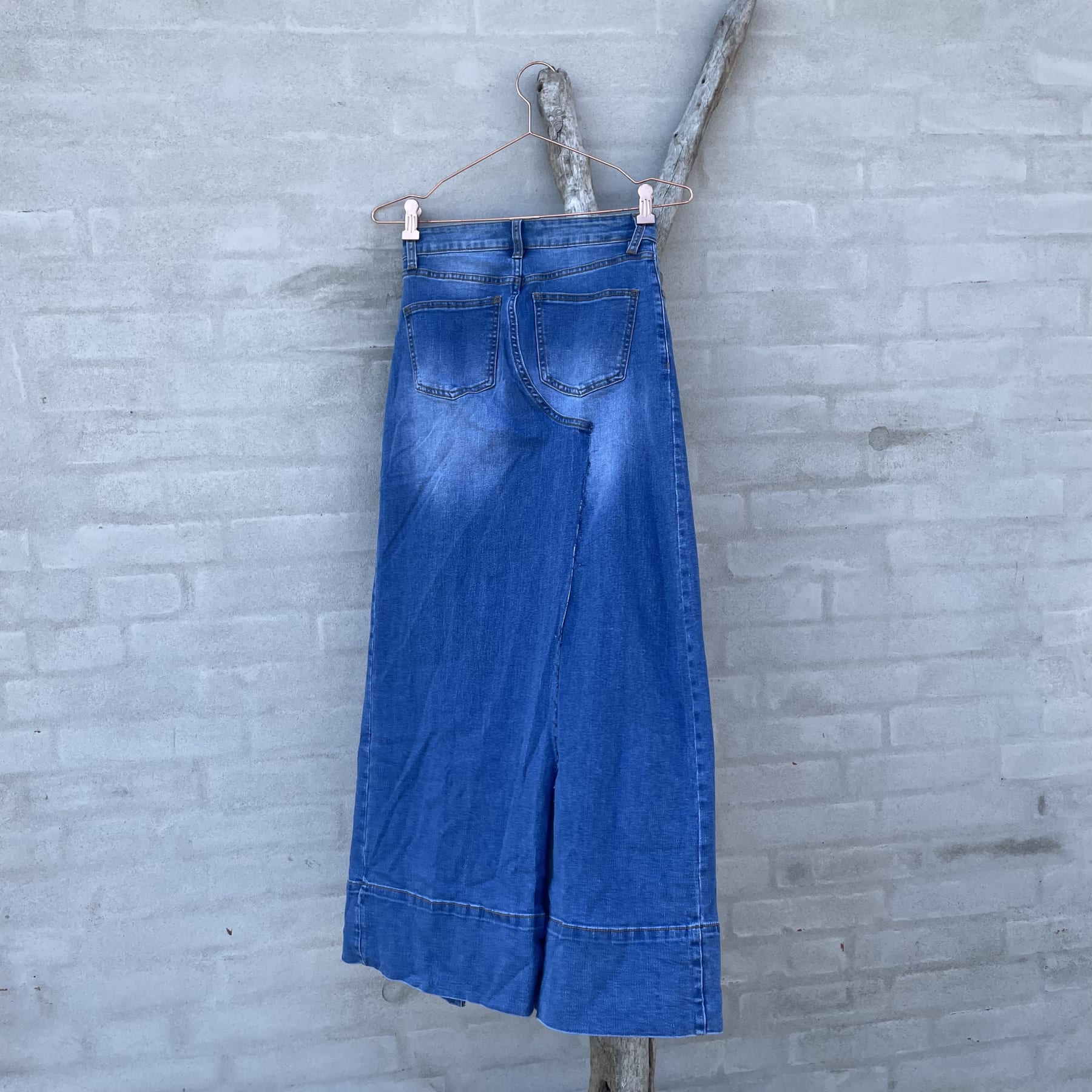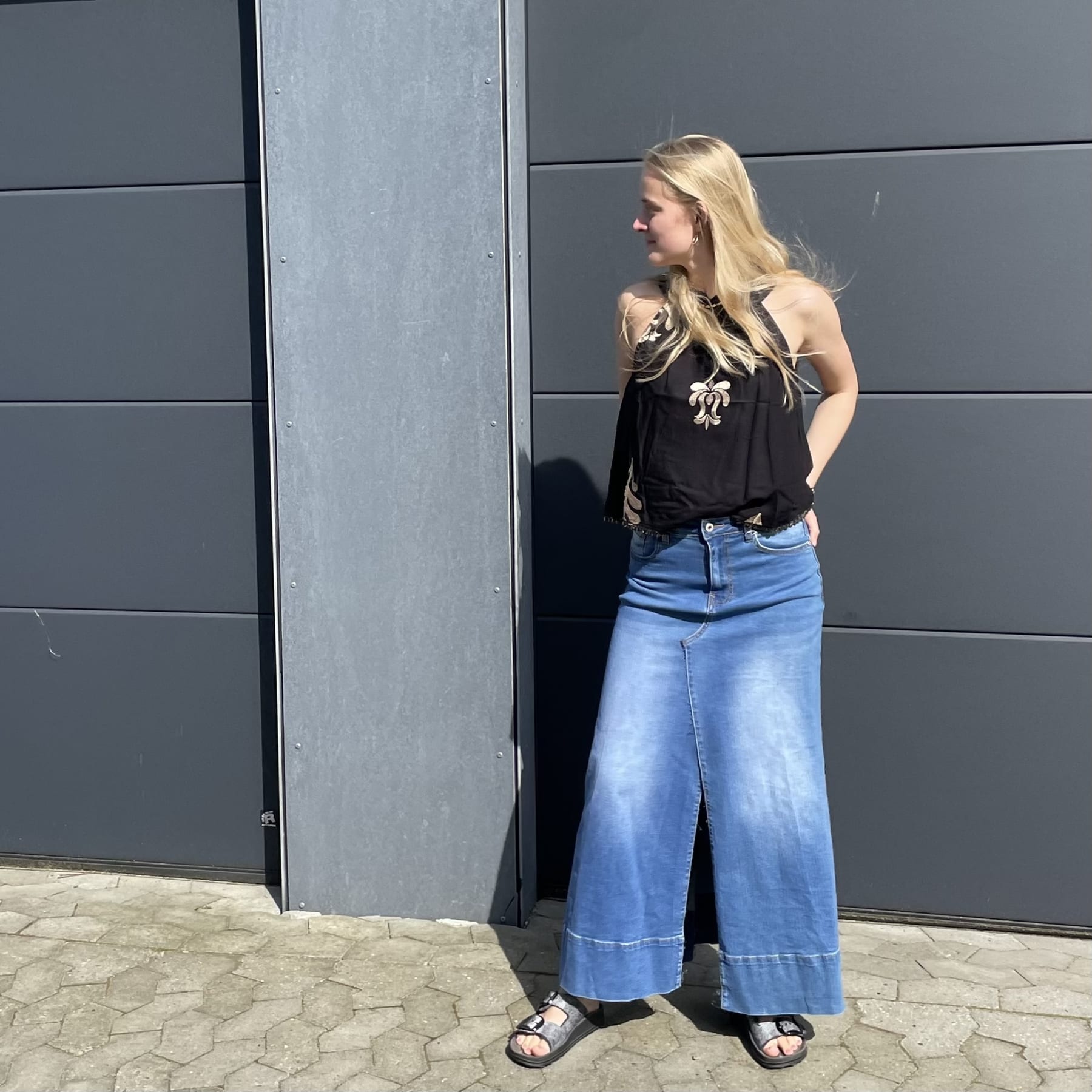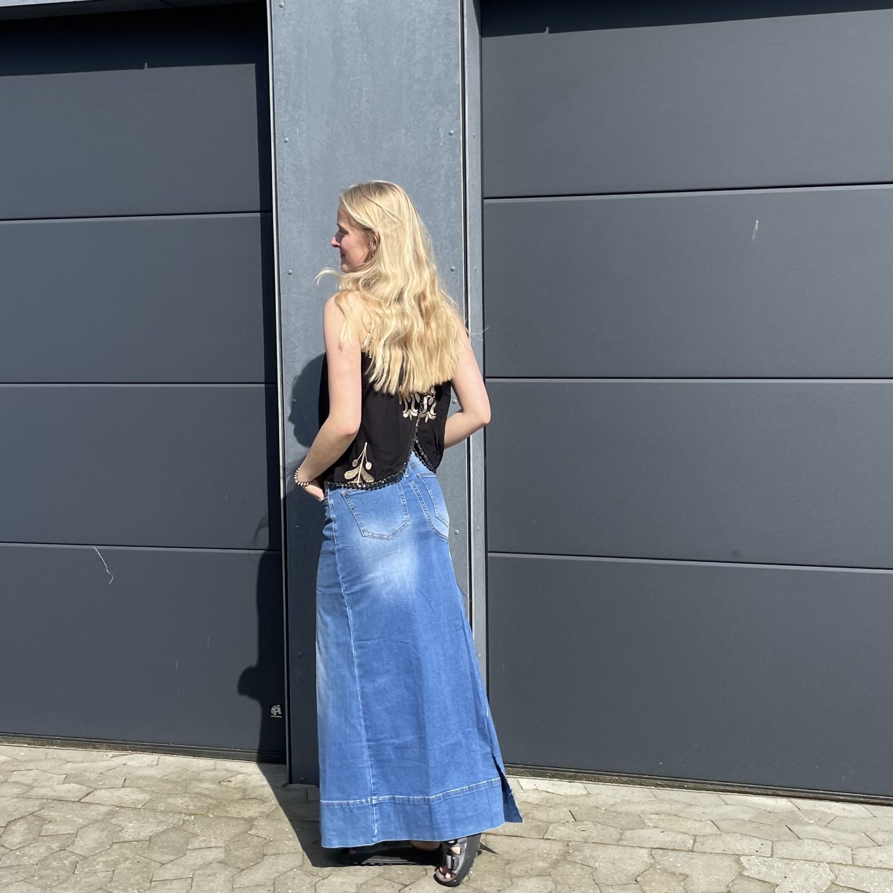 Tøft langt denim skjørt med bred kant nederst. Rå kant bak i søm.