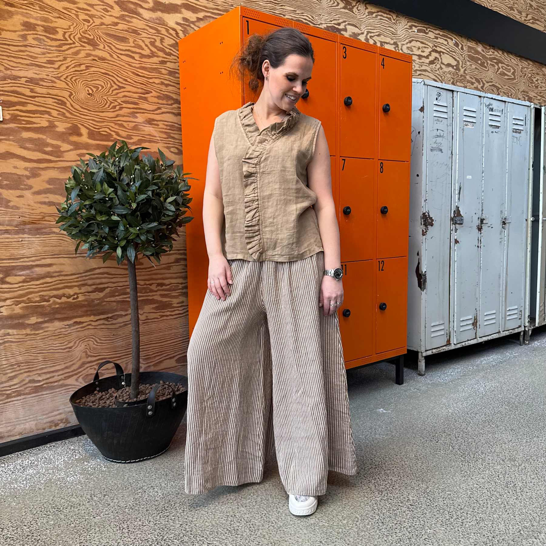 Kul bukse i 100% lin fra Cabana Living. Buksen har strikk i livet og vide bein. Den perfekte, luftige sommerbuksen!