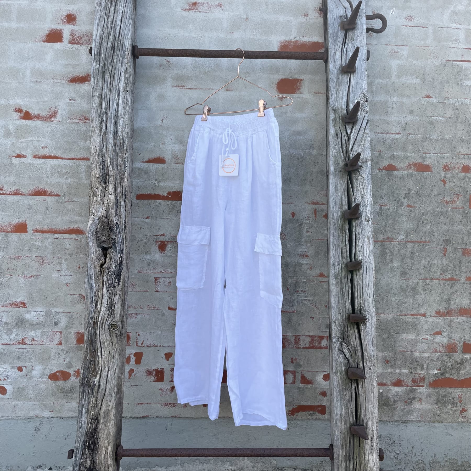 Hvit cargobukse i lin med lommer på siden og vide ben.