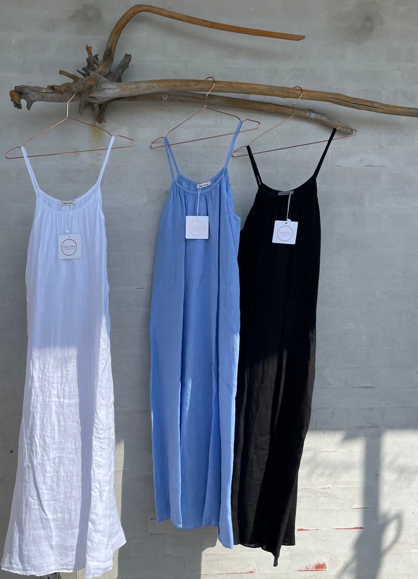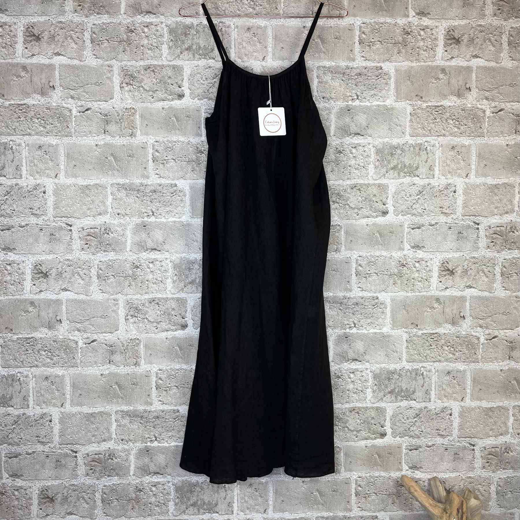 Lang lino kjole med smale stropper og rund utskjæring foran og bak