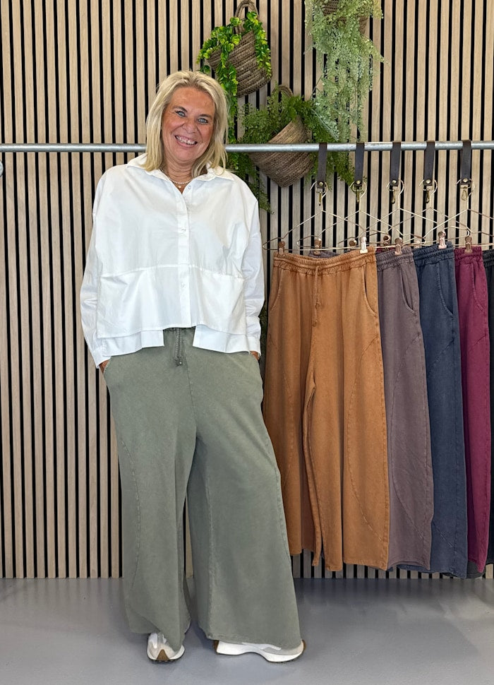 Super komfortabel "kosebukse" i bomull i nydelige høstfarger! Kul vasket look, vid i modellen.
