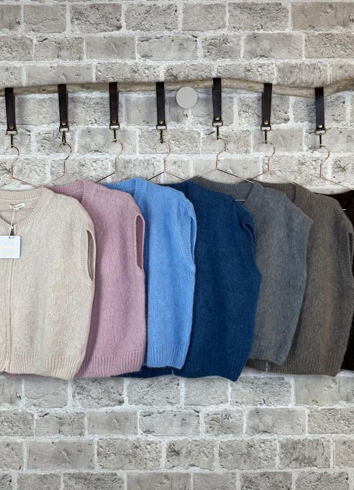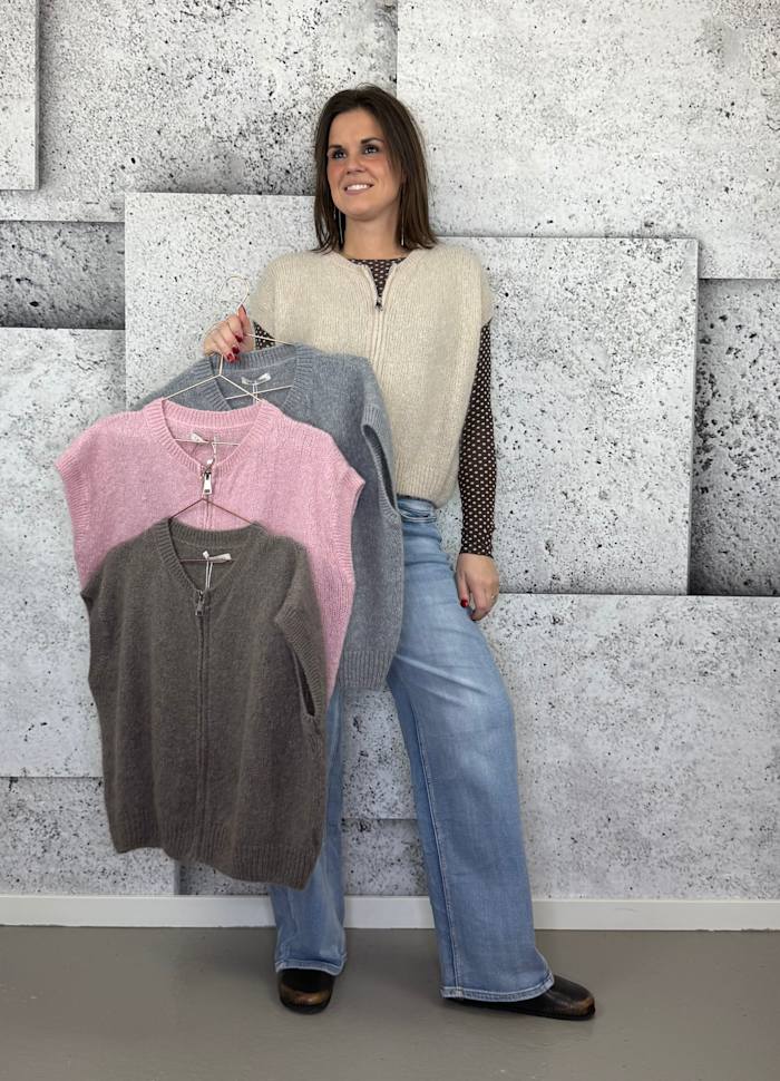 Myk strikke vest med glidlås i front, perfekt å bruke over bluse eller kjole