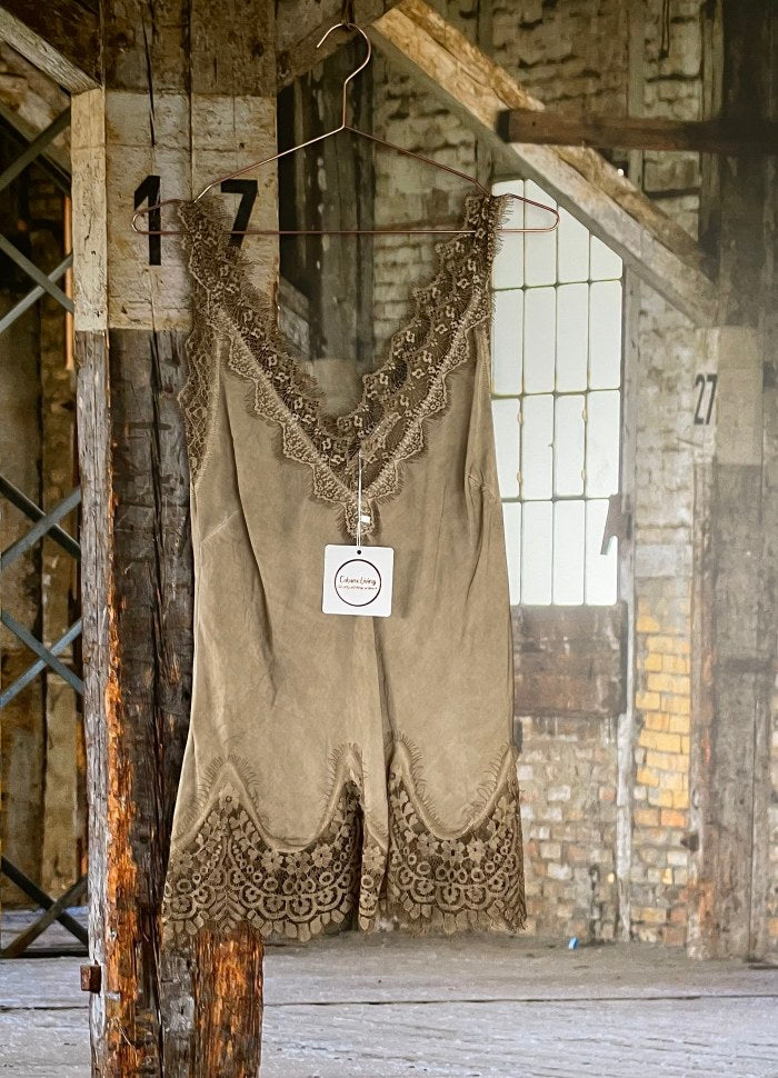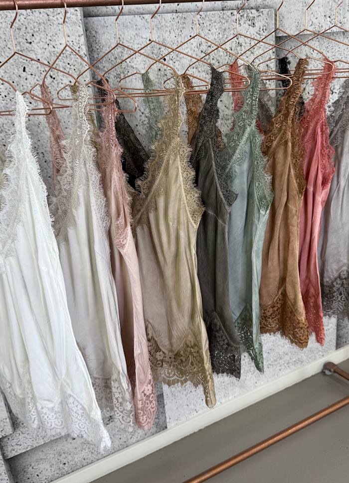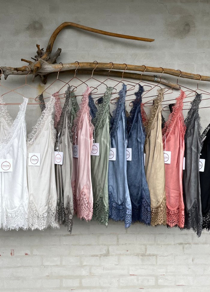 Topp i vasket viskose med blonde stropper og blondekant.