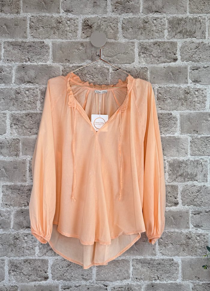 Fin sommer bluse i tynn behagelig bomull med en liten volang kant på kraven med blonder. Skjorten har v/ hals med knyting og strikk nederst på ermene