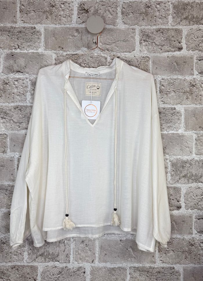 Kul bluse i vasket bomull i en litt oversize fit, knyting med dusker som en fin detalj