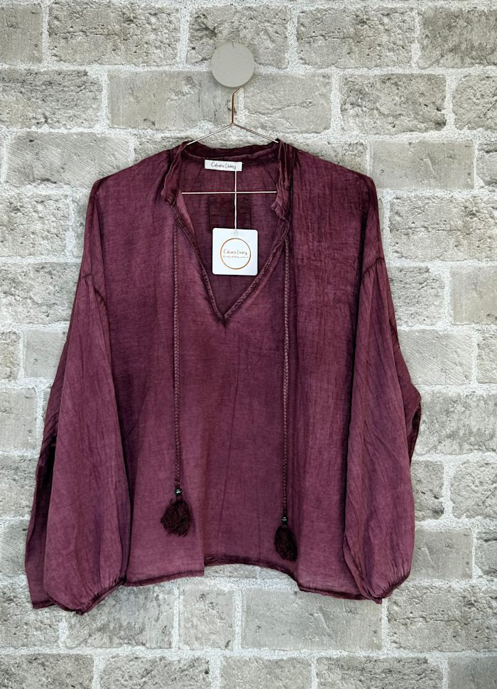 Kul bluse i vasket bomull i en litt oversize fit, knyting med dusker som en fin detalj