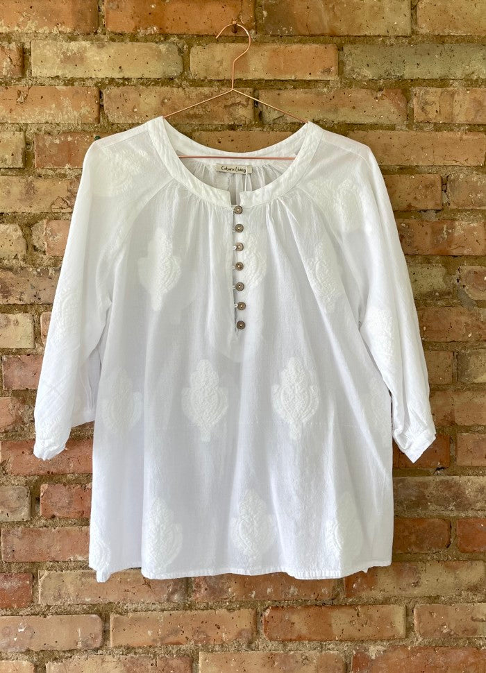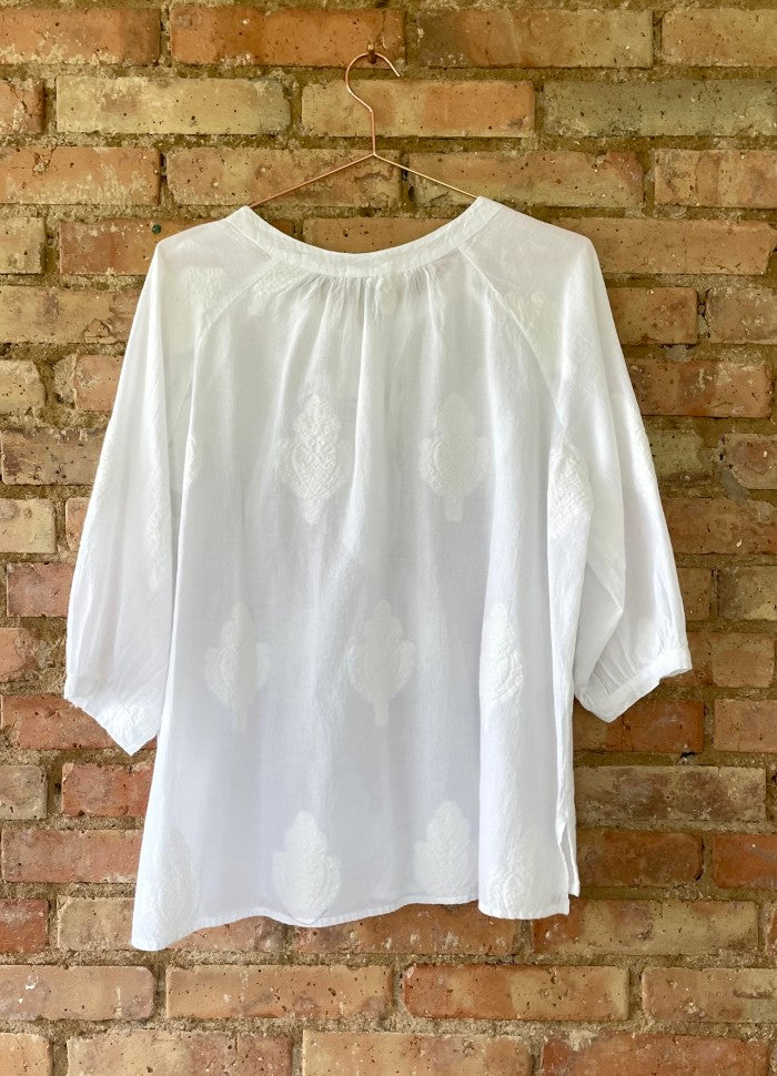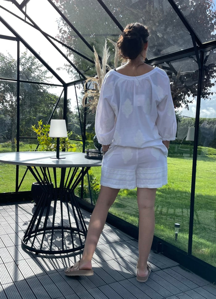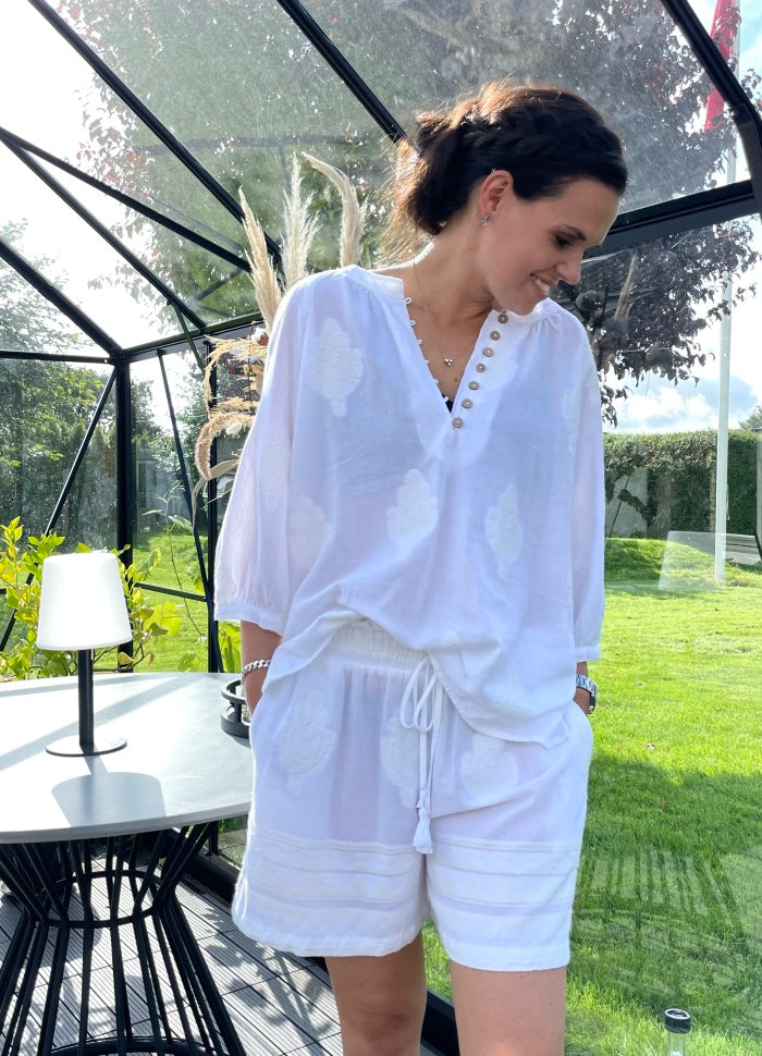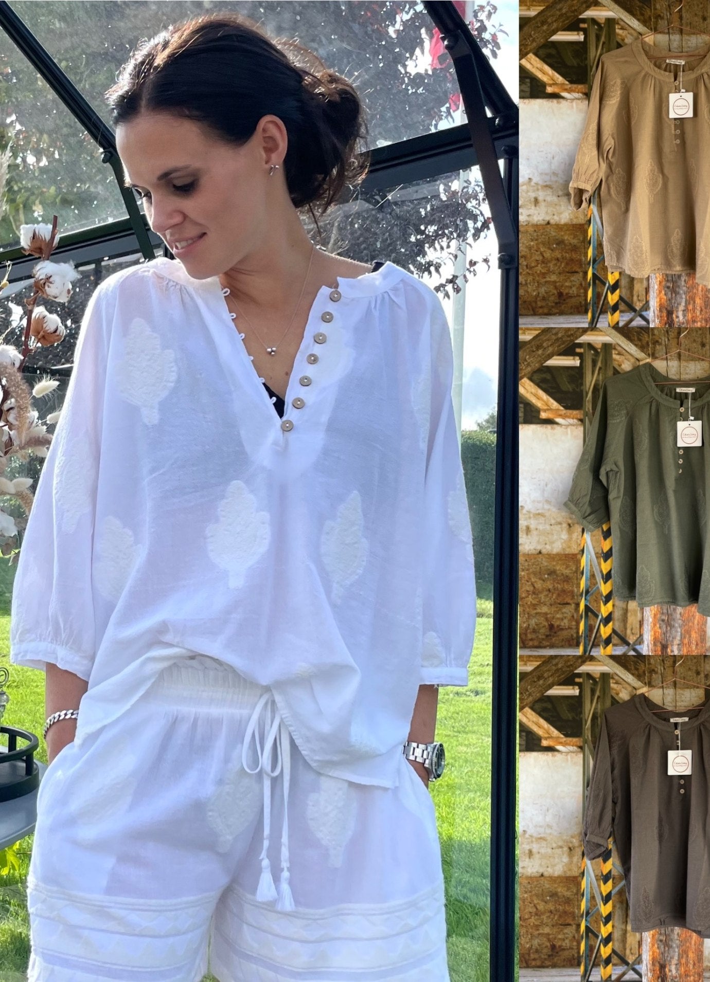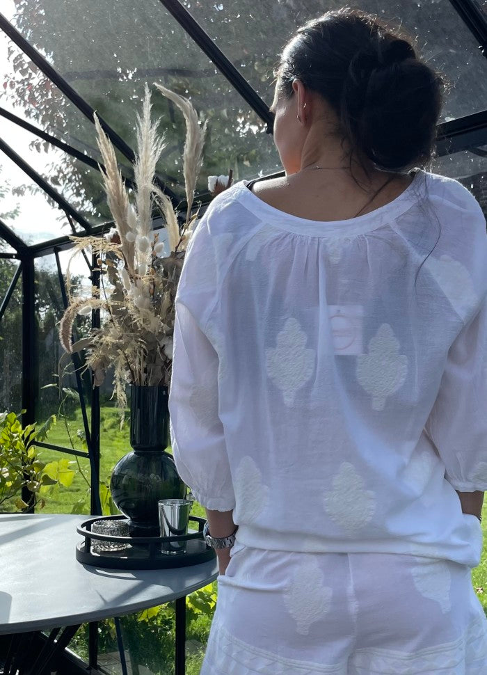 Bluse i eksklusivt tone i tone broderie, med kinakrave og knappe lukning