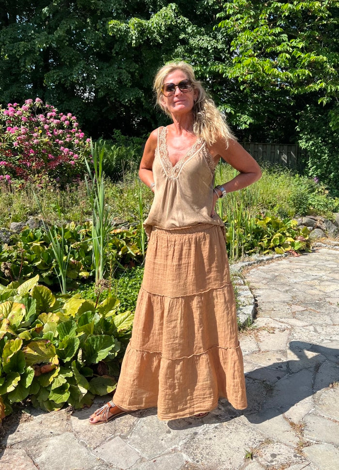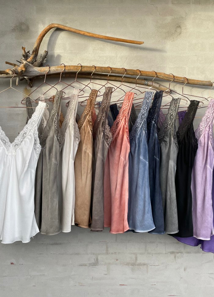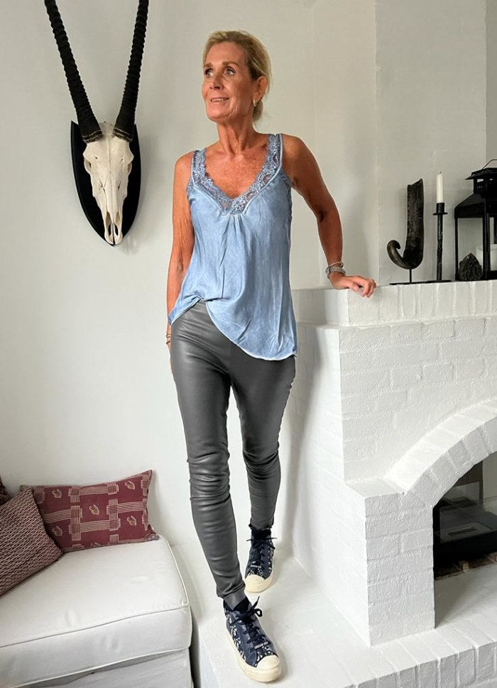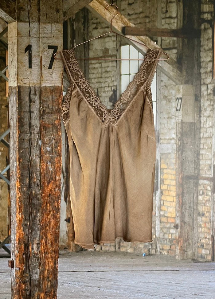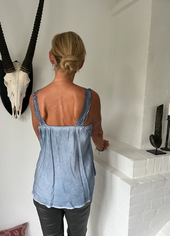 Topp i vasket viskose med blonde stropper.