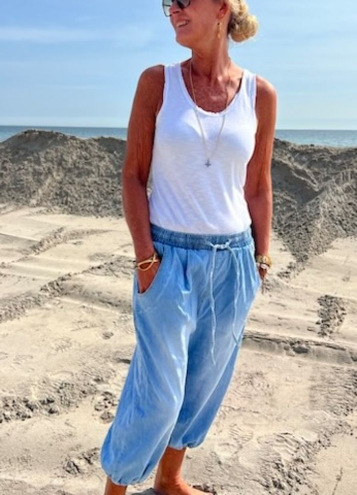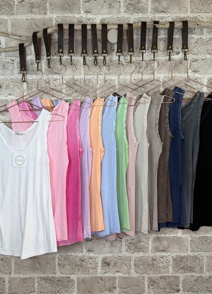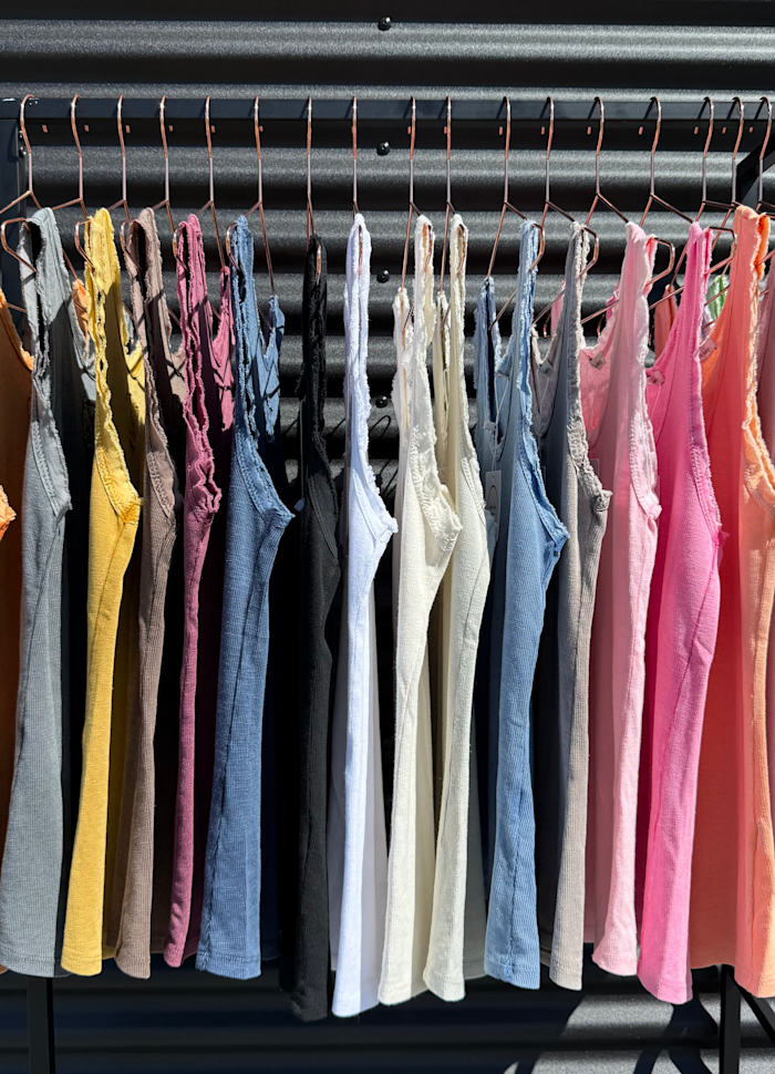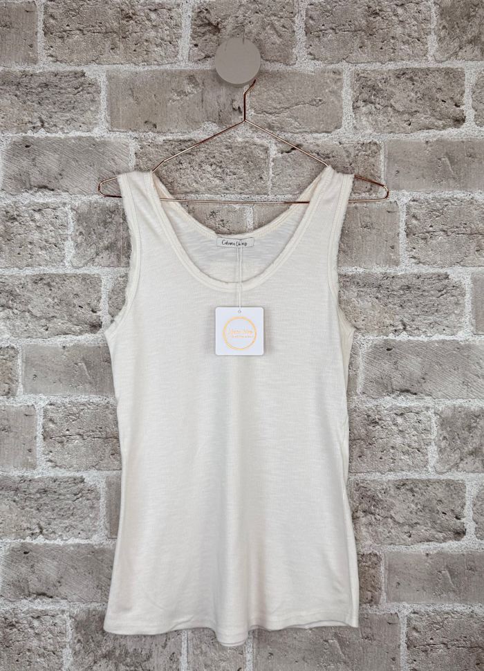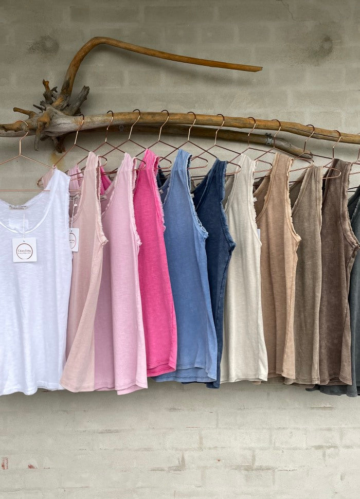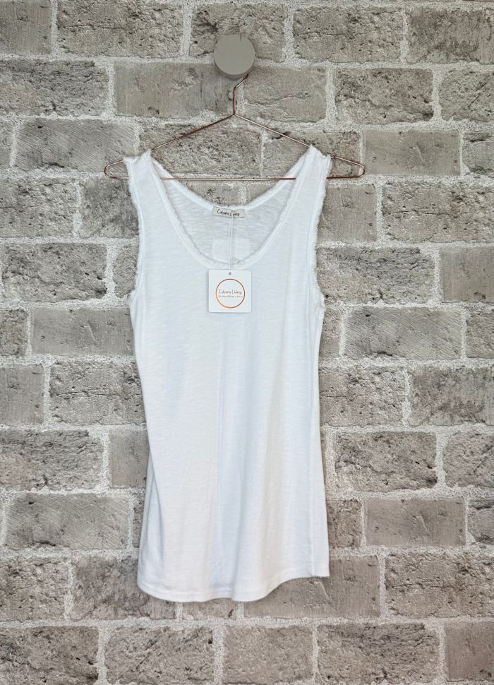 Cool bomulls tank topp, med rå avslutninger rundt hals og arm åpning.