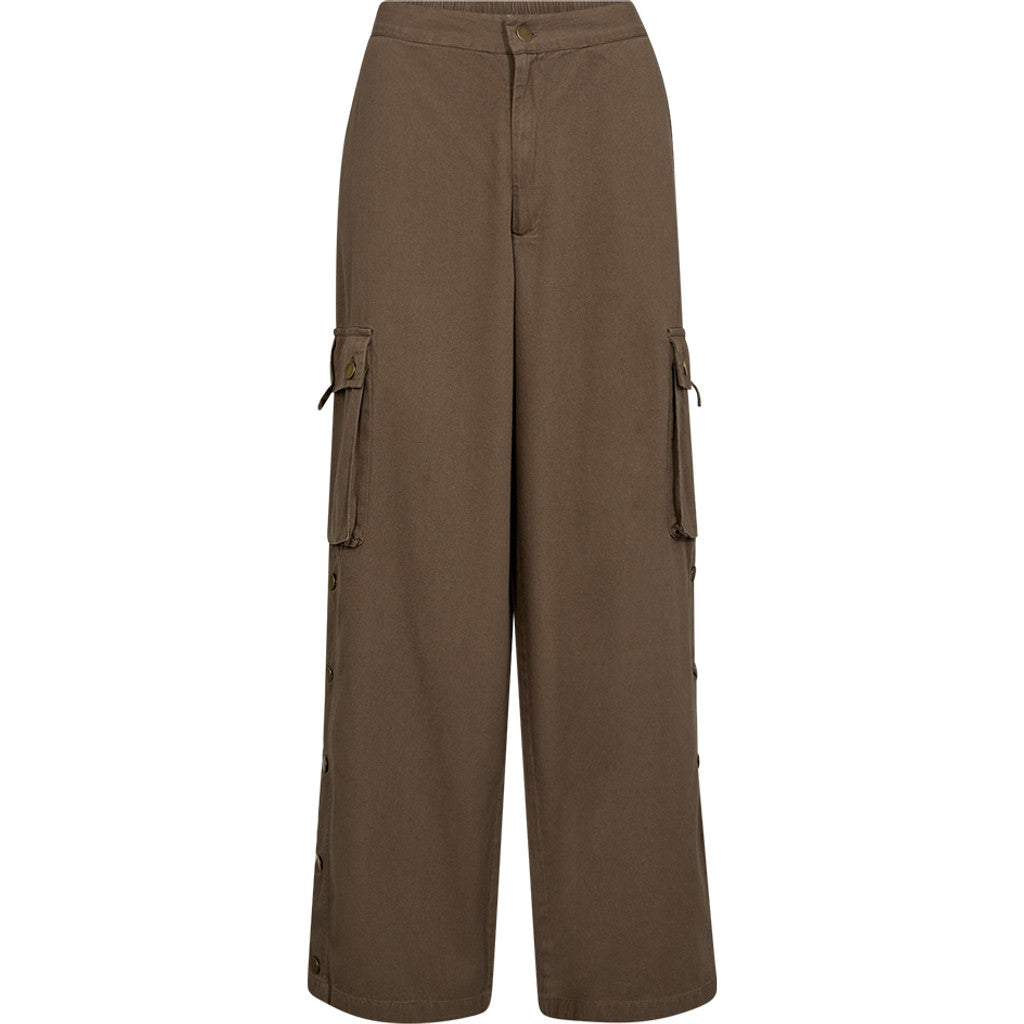 Super kul bukse fra Depeche i militær stil. Buksen har lommer på siden, vide ben og knappe detaljer på siden. En tøff bukse du kan "dress up" eller "dress down". Buksen har strikk bak og vanlig glidelås og smekk i front, den har rette ben og full lengde.