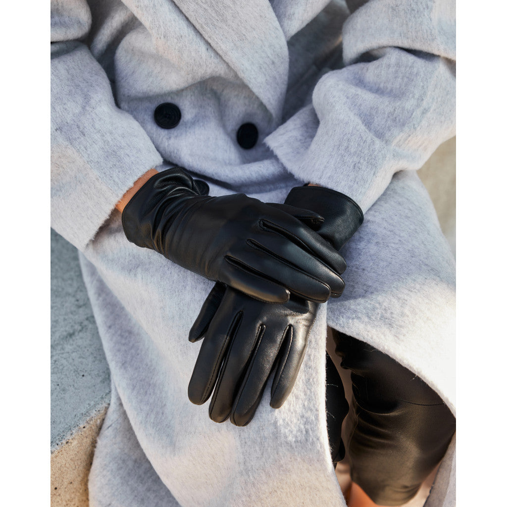 Lekre, tidløse skinnhansker fra Depeche linet med ull innvendig. Perfekte hansker på kalde dager. Hansken er helt simple i sort skinn uten detaljer.