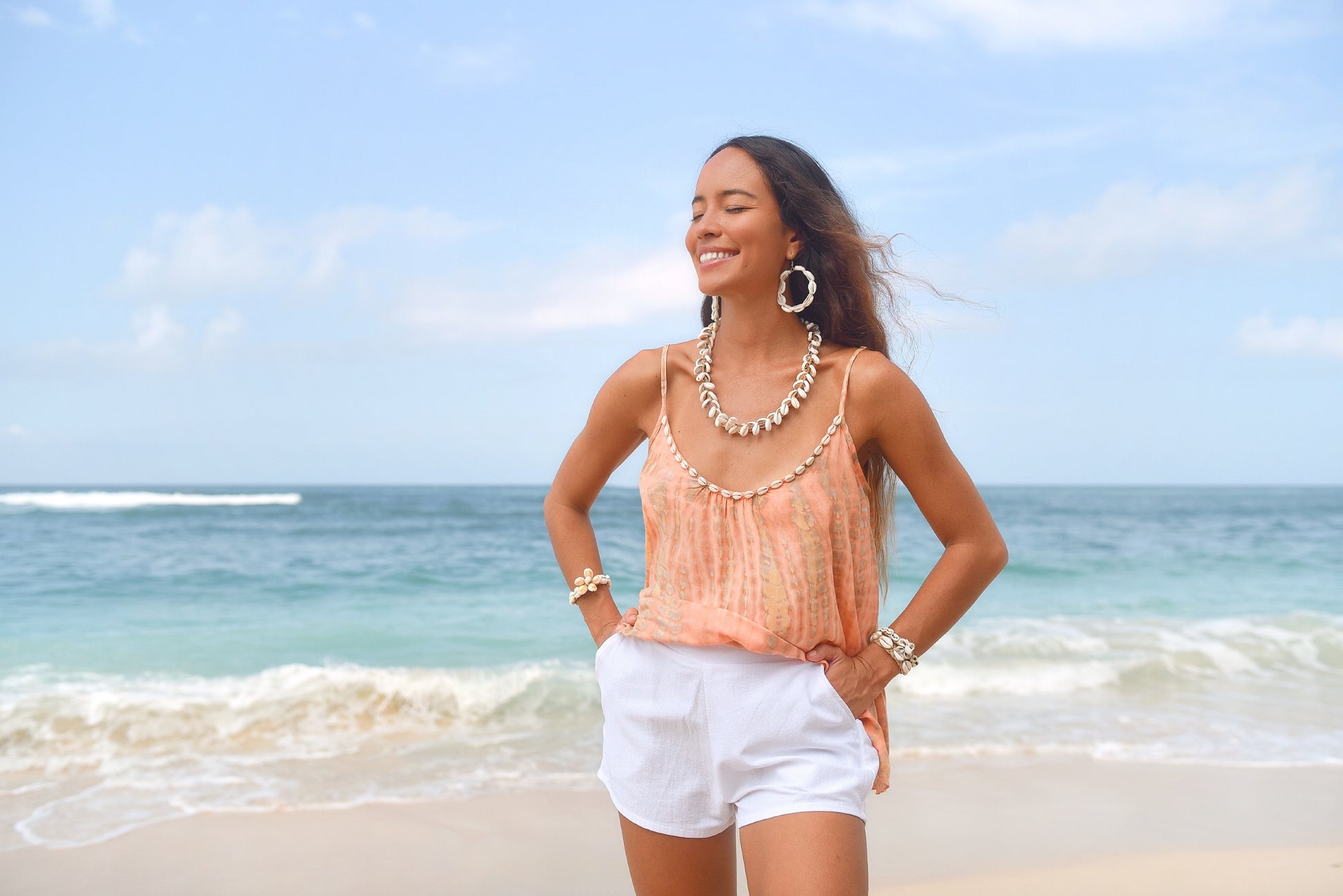 En feminin og lekker topp i Hot Lava's kjente "Anna"-serie. En perfekt sommertopp i 100% myk rayon voile. Toppen har justerbare stropper og håndsydde skjell langs halsen.
