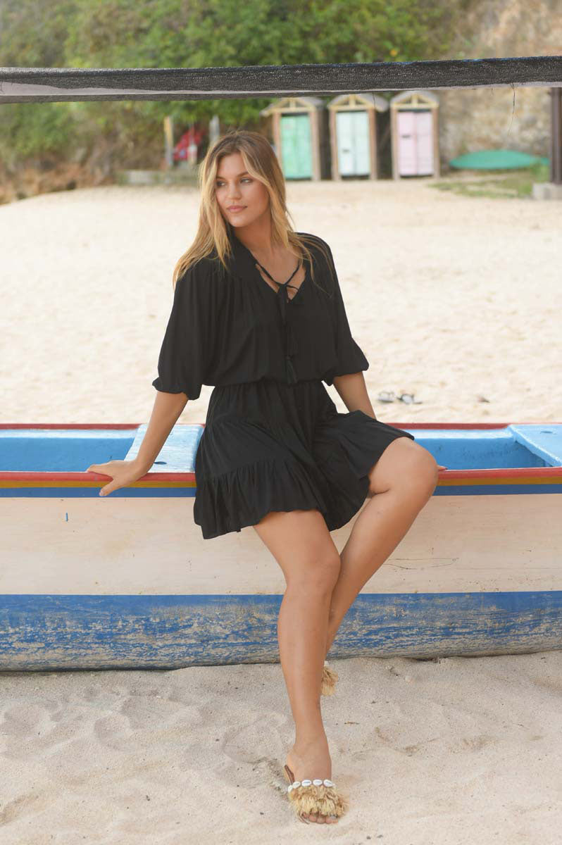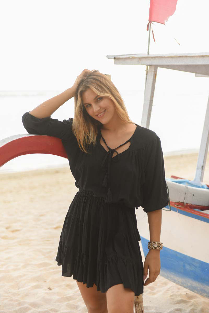 Denne kjolen stopper akkurat over kneet og har albue-lange ermer. Kjolen har elastisk knyting i livet som du kan knyte selv - og dermed velge om du vil ha den løs eller stram i livet. Kjolen har også dekorativ knyting med dusker i halsutringningen. Denne løse og behagelige viskosekjolen er perfekt for varme sommerdager! ☀️