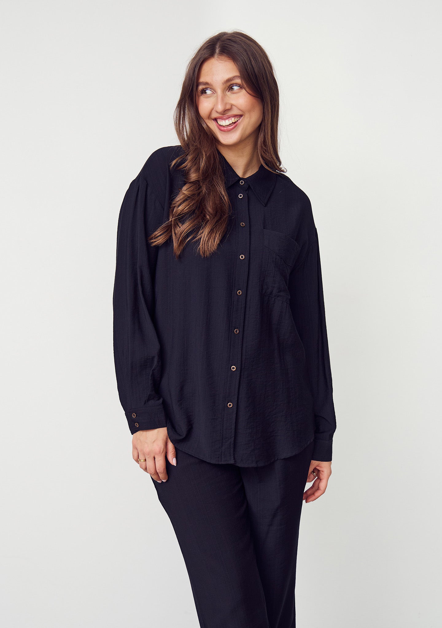 Med sin løse passform, myke brystlomme og diskrete knapper foran kombinerer Elly Basic Shirt klassisk snitt med moderne komfort. Den perfekte basisstilen for både kontorantrekk og avslappede dager som krever litt ekstra kant.