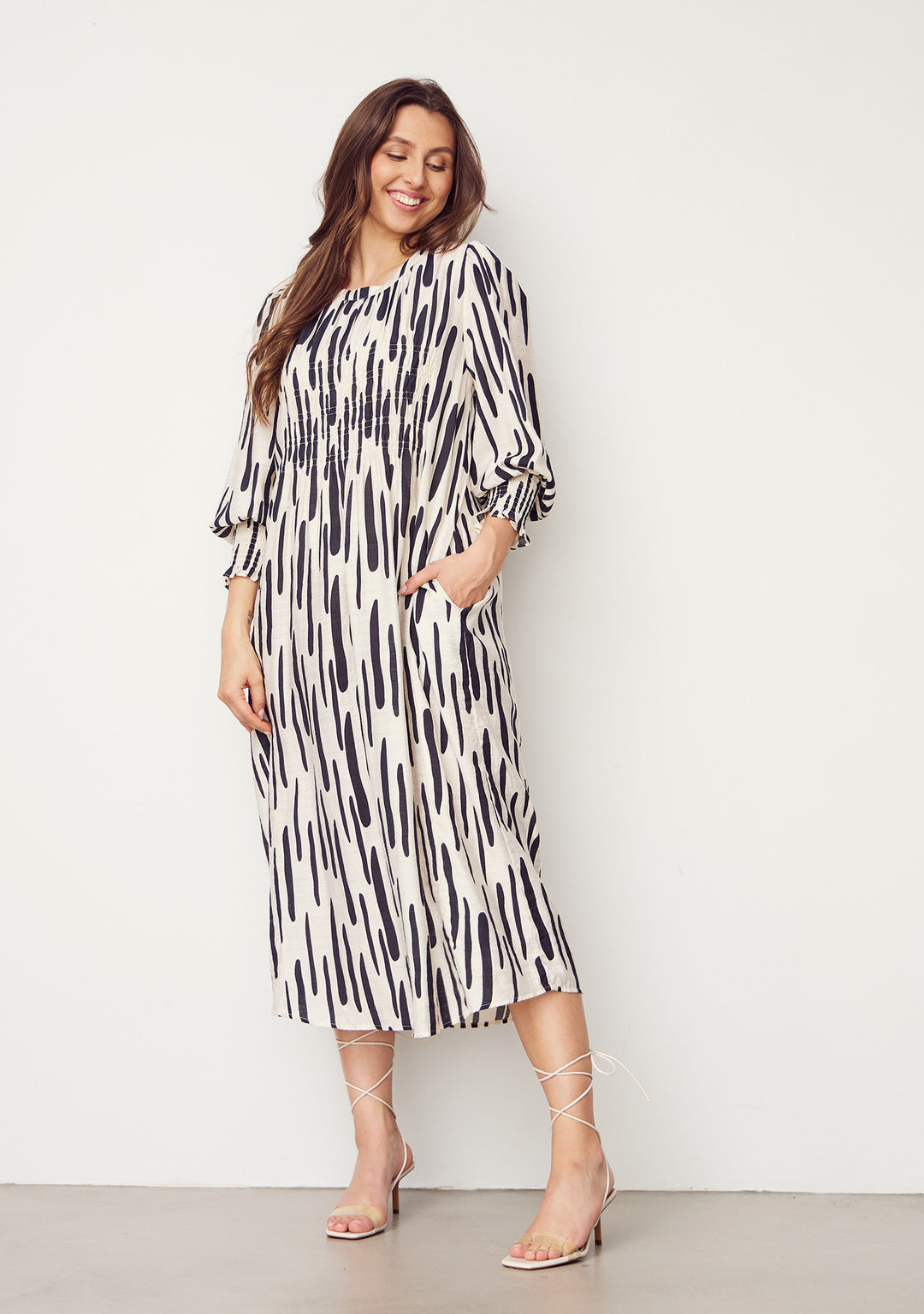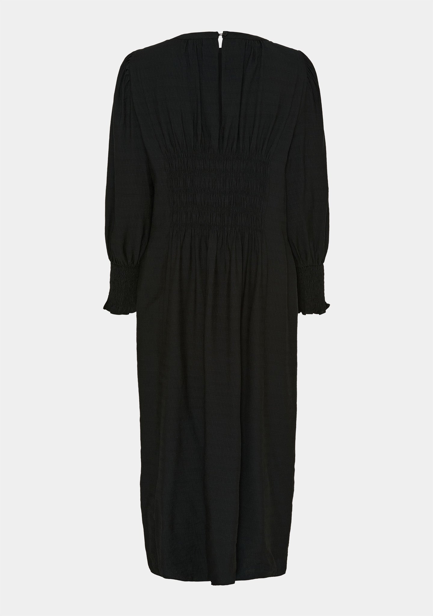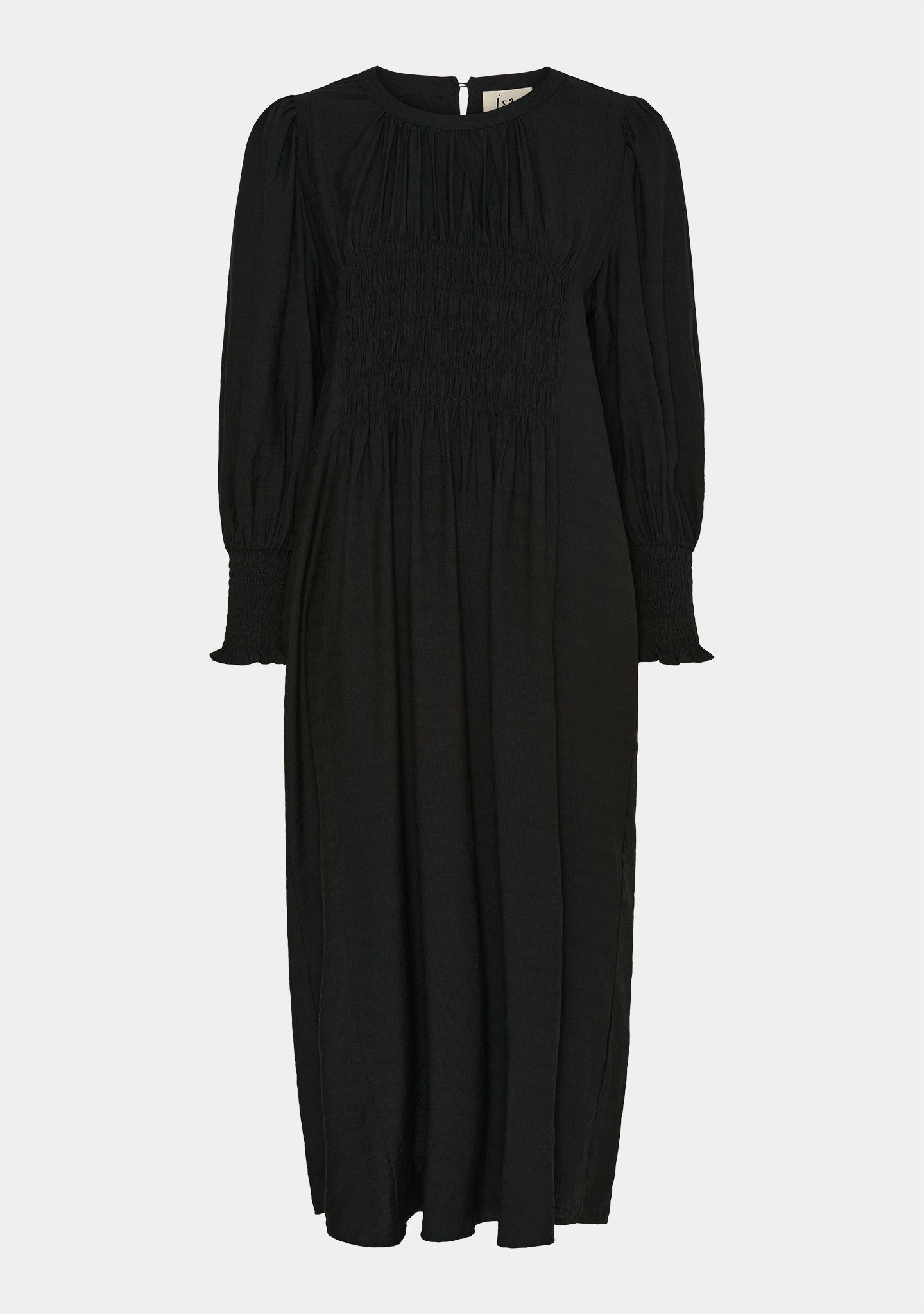 Ane Smock Dress med lekkert struktur i stoffet, med sin elegante snitt. Det unike trekket ved kjolen er den rynkede smockkanten ved overkroppen, som vakkert fremhever figuren på de helt riktige stedene. Med en midi-lengde, en rund hals og ballongermer med smockkant kombinerer Ane Smock Dress klassisk eleganse med moderne detaljer. Kjolen er behagelig å ha på, takket være de kvalitetsmaterialene - 80% LENZING™ ECOVERO™ viskose og 20% polyamid - som sikrer en lett og pustende fall. Style Ane Smock Dress med et par høye støvler - mulighetene er endeløse med denne kjolen.