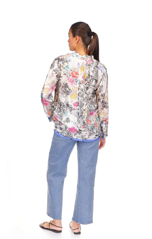 Johnny Was er kjent for sine kunstneriske print og design. Denne lekre blusen er inspirert av Paris, med eiffel tårnet og blomster er dette en lekker bluse du kan bruke til både hverdags og fest. Blusen er i 100% silke.