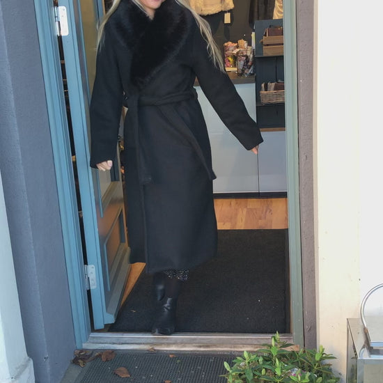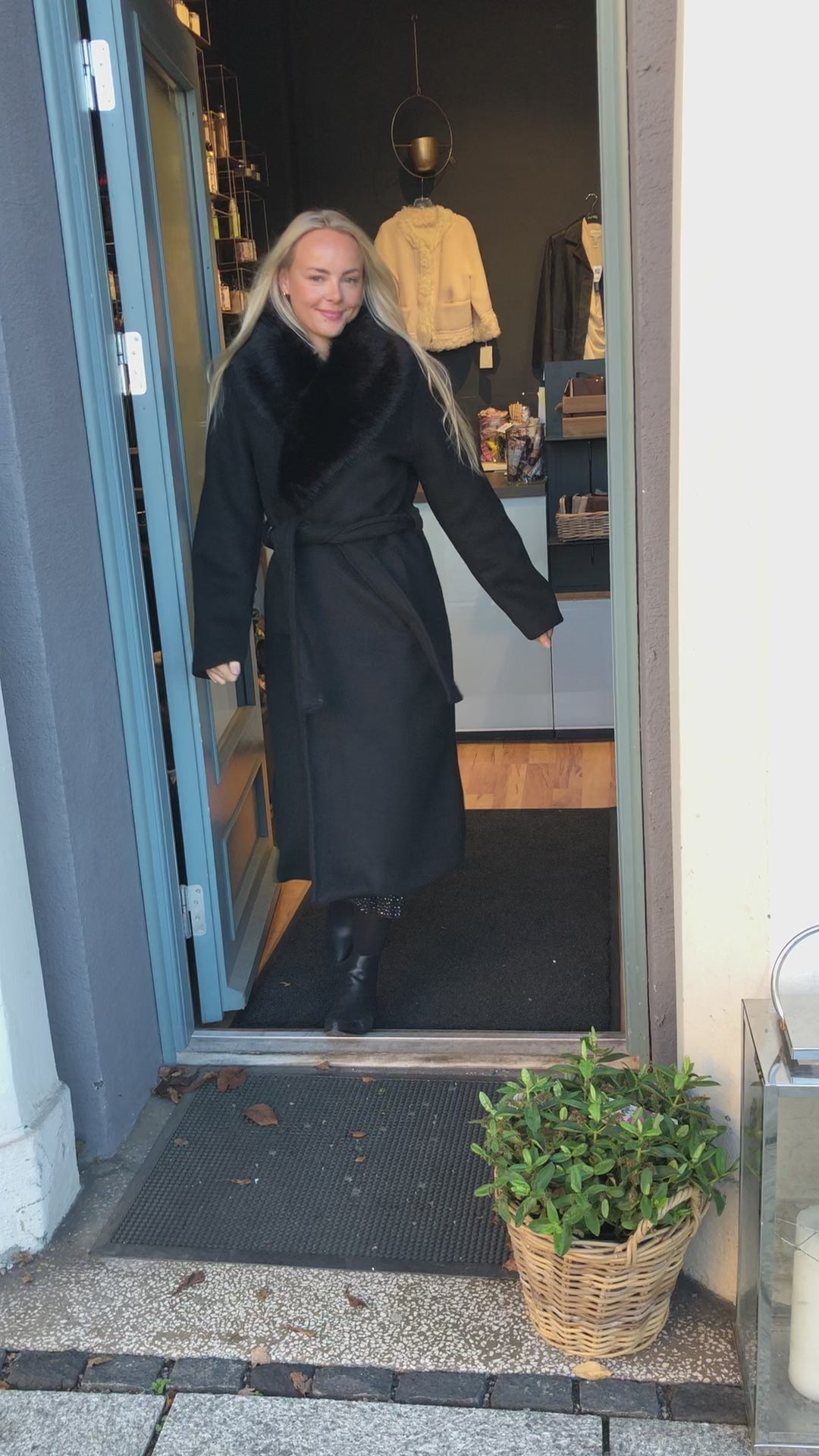 Herlig lang kåpe med fuske pels krage knytebelte og knapp i midjen