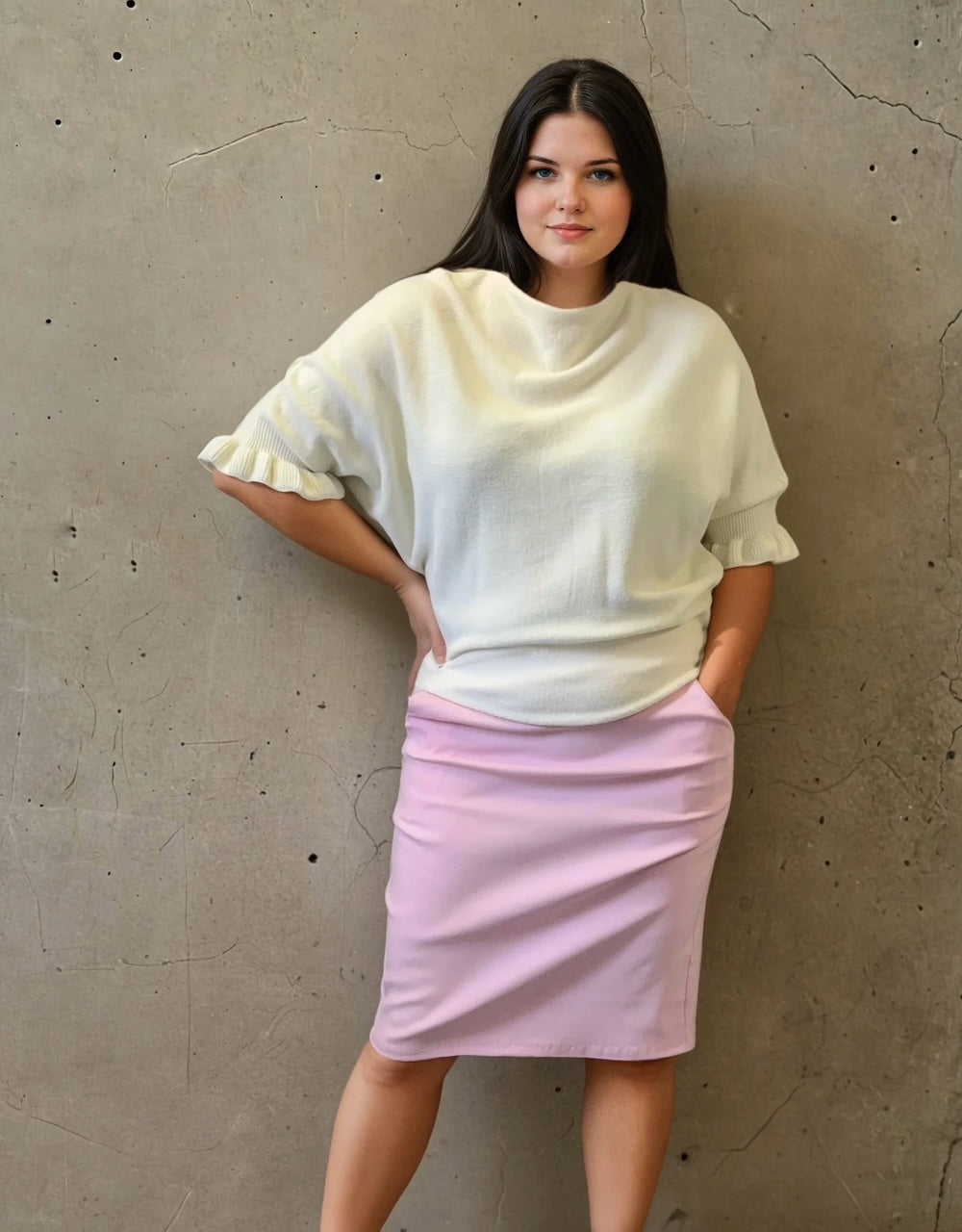 Skjønt skjørt med god stretch som går over knee. Lommer i siden og strikk med knyting i midjen. Samme stoff som magiske buksen.