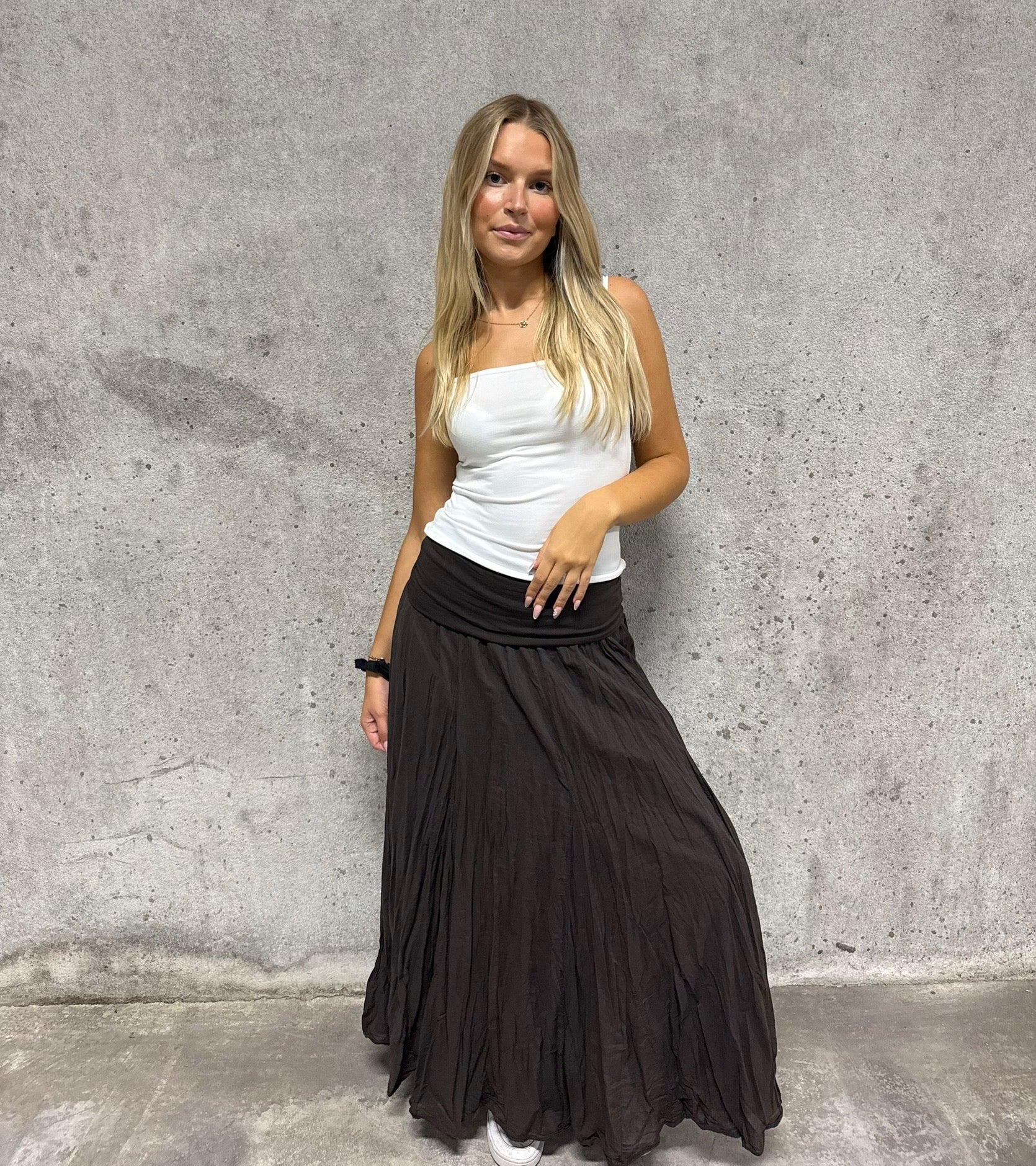Et fint skjørt som du kan pynte opp og ned, skjørtet har bred linning i livet som kan brettes ned for justering av lengden