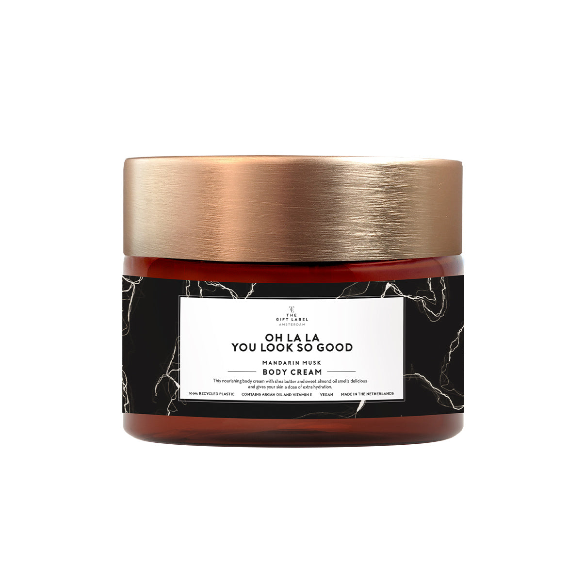 En god bodyskrubb, i dekorativ boks med "OH LA LA YOU LOOK SO GOOD" tekst fra merket The Gift Label. Perfekt gave, gøyal å gi og gøy å få! Lukter nydelig av mandarin musk.