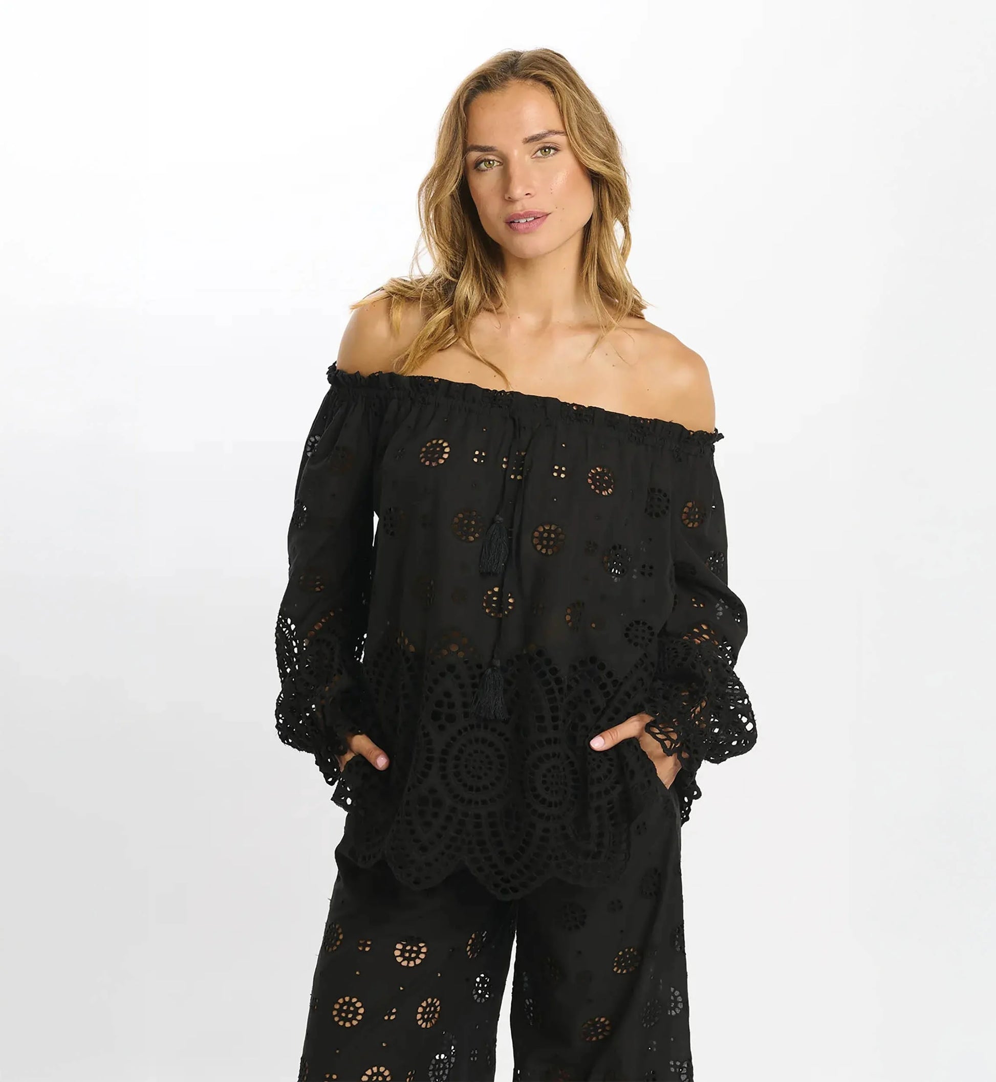 Nydelig blondebluse fra Miss June i 100% bomull. En nydelig, lett og luftig sommerbluse du kan bruke både off-the shoulders eller som en vanlig bluse med litt utringet hals. Super lekker 🌴