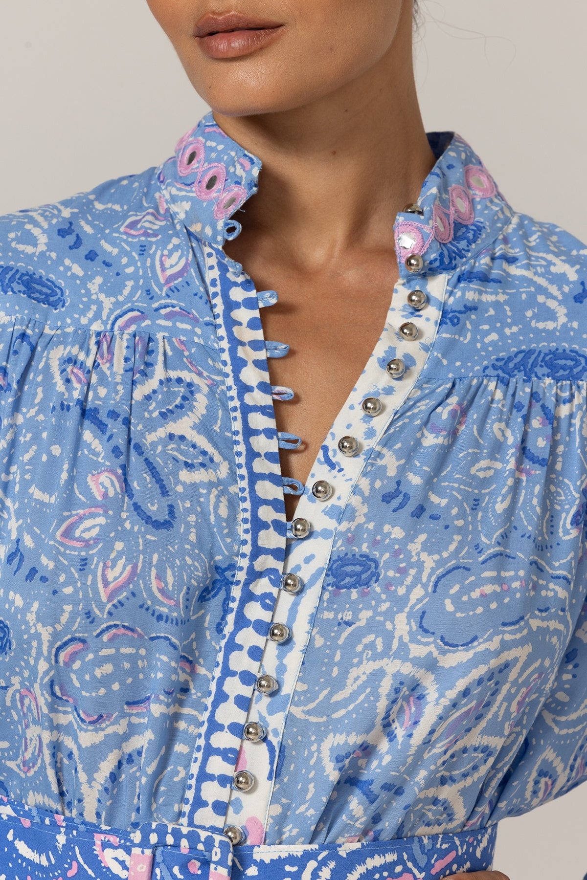 Lekker kjole i et nydelig tynt modal materiale fra Miss June. Denne nydelige kjolen er et must-have i garderoben. Bruk den på varme sommerdager med sandaler, på fest med heler eller på jobb med sneakers. En luftig og lett kjole med nydelig mønster i blåtoner. Det følger med underkjole og belte i matchende stoff.