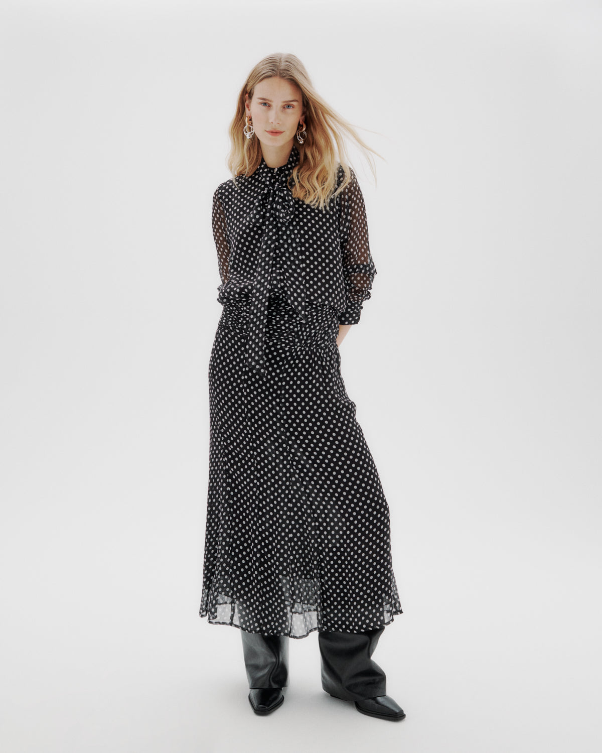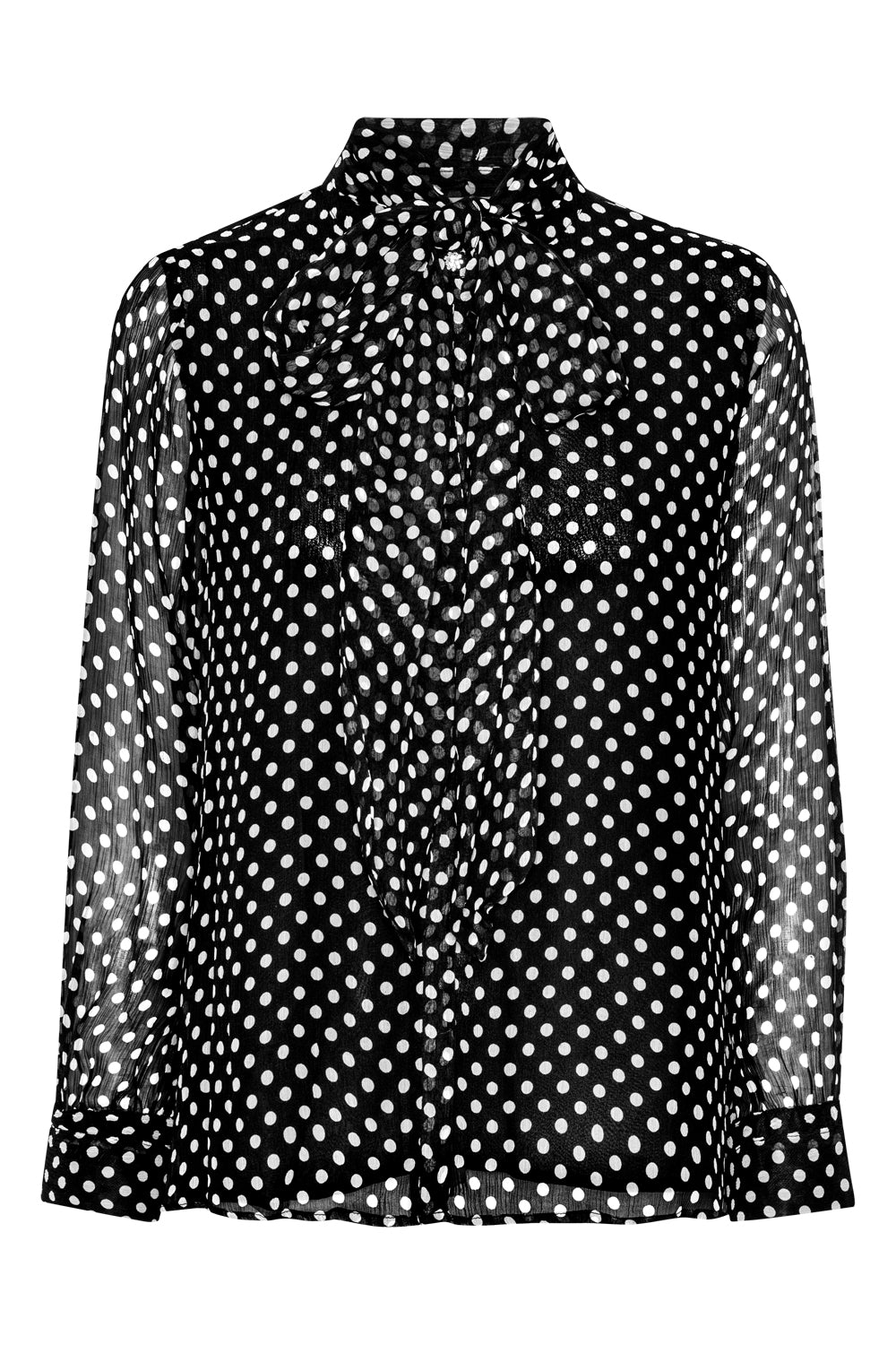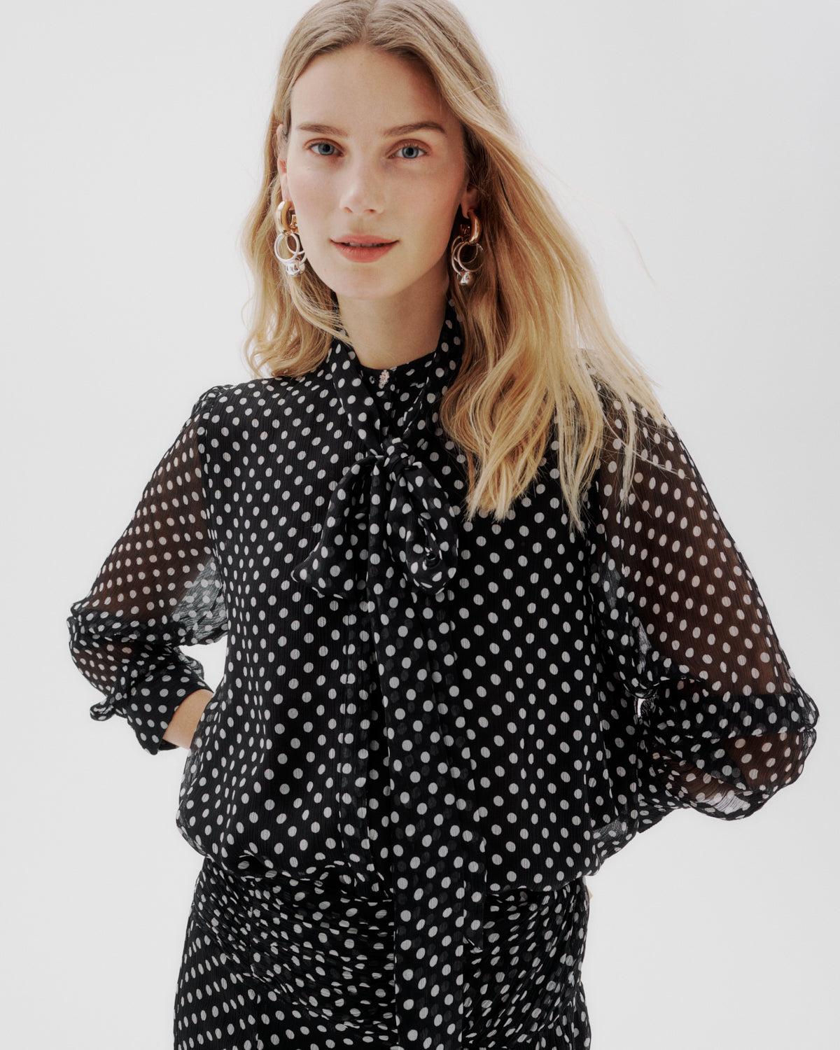 Lekker bluse i i sort-hvitt polkaprint. Rund hals med knyting og lukking med knapp. Knytingen i halsen kan taes av. Rette ermer med knapper nederst.