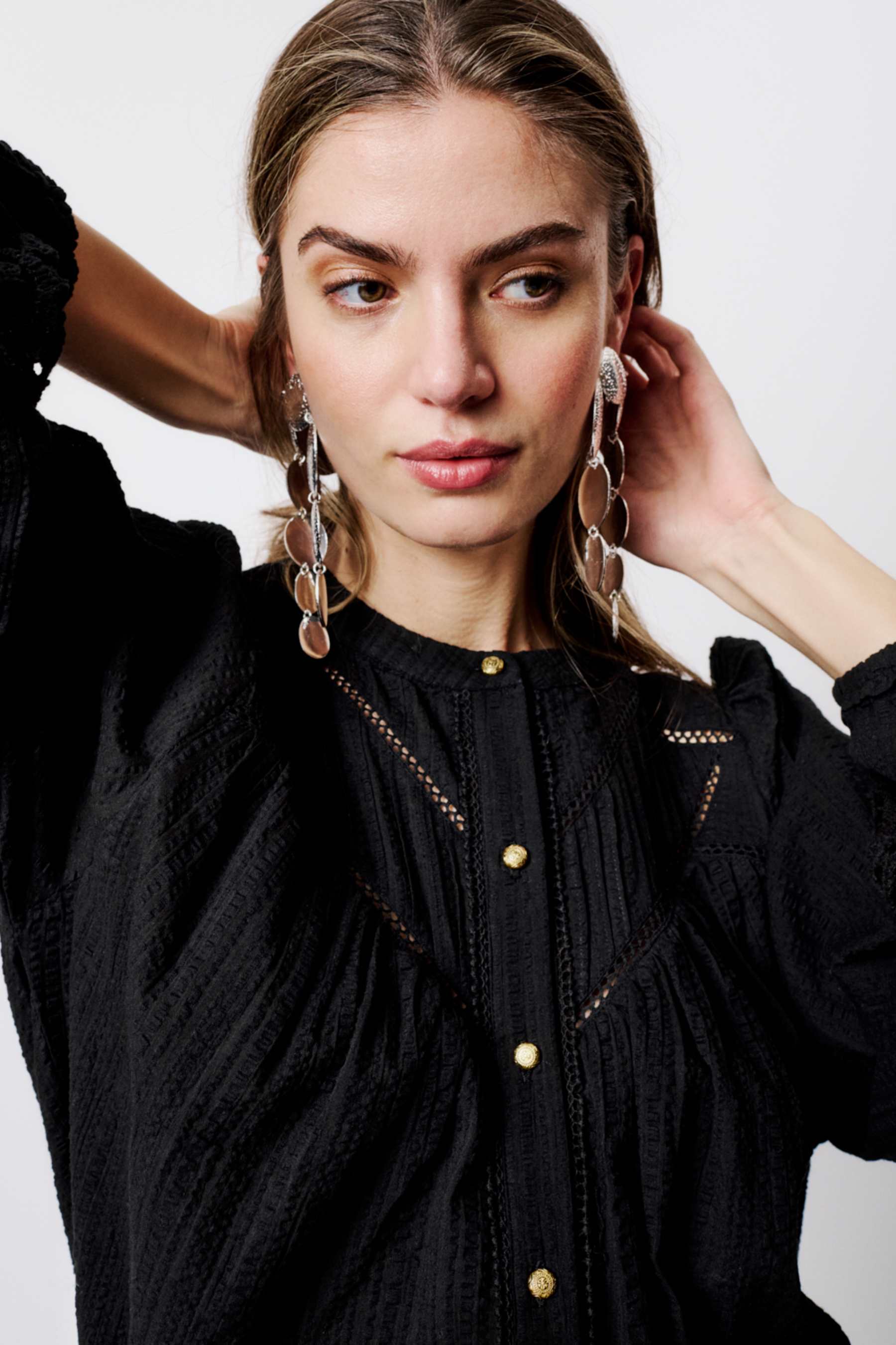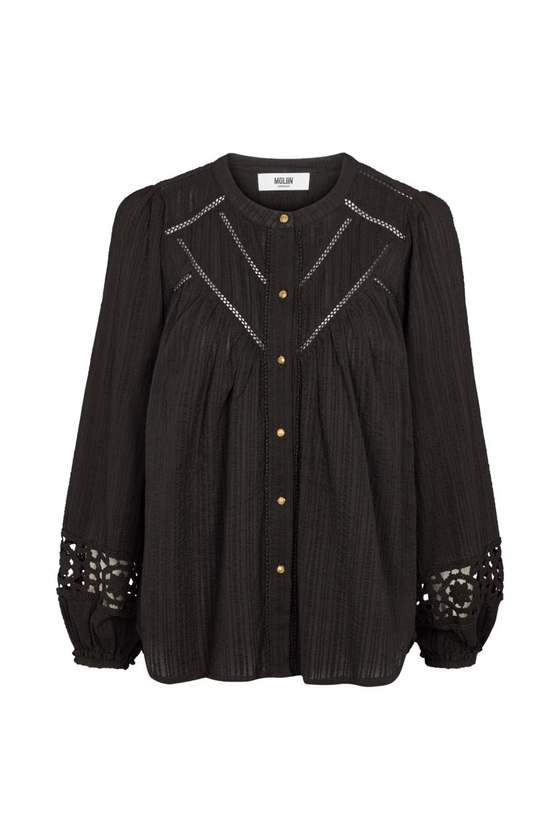 Lekker sort bluse fra Moliin laget i 100% bomull. Blusen har lekre blondedetaljer på ermene og brystet, og knepping hele veien i front.