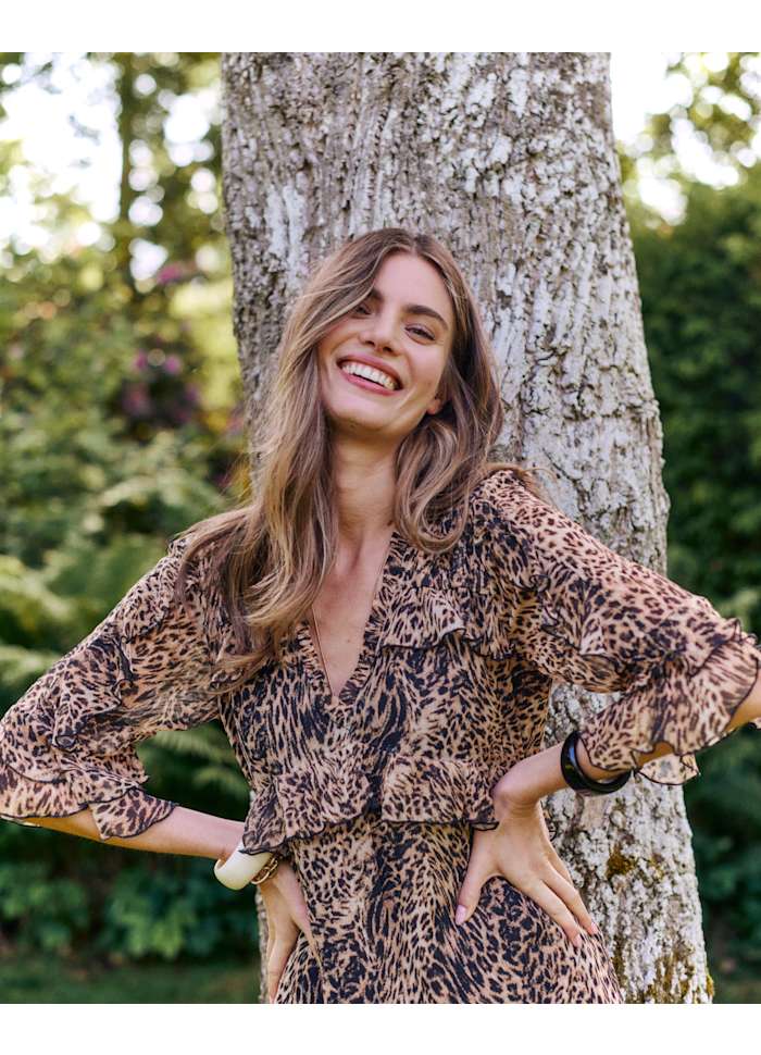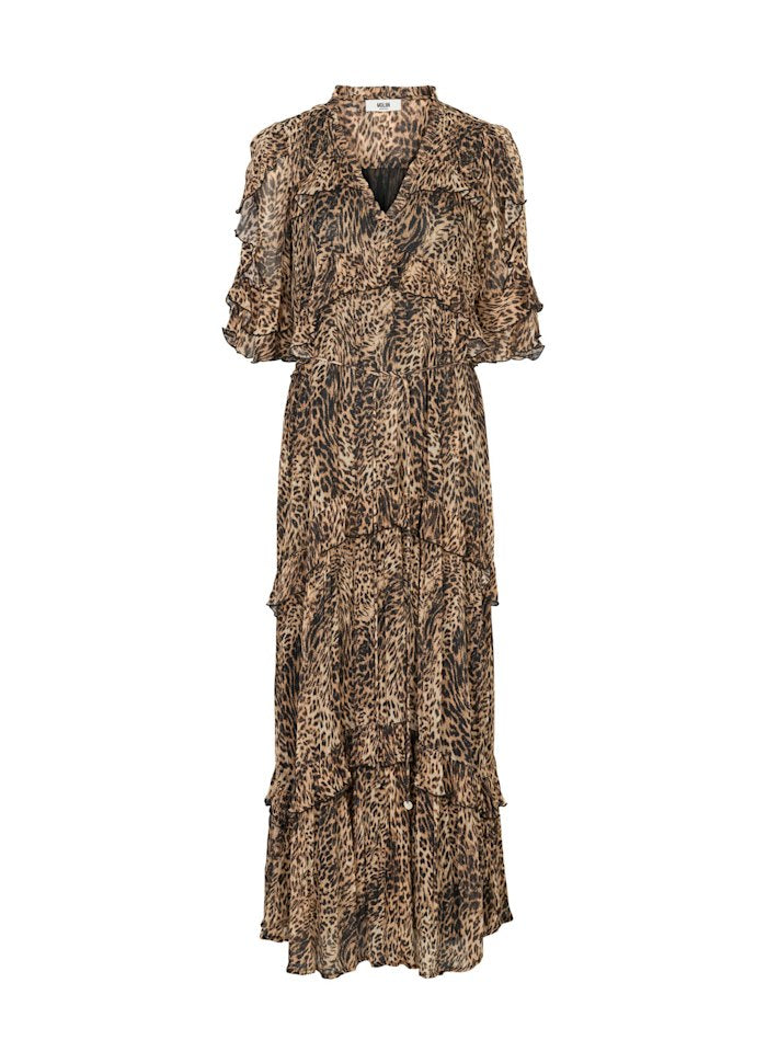 Vivaldi dress is a long, elegant dress with a flowing silhouette, crafted in an all-over leo print viscose. It features long sleeves with soft volume and ruffle detailing along the sleeves and body, creating a layered and feminine expression. The neckline is finished with a slit opening and tie strings, while gathered seams and ruffle panels add movement throughout the skirt. A ruffled hem completes the dress, making it a standout piece with a strong bohemian feel.