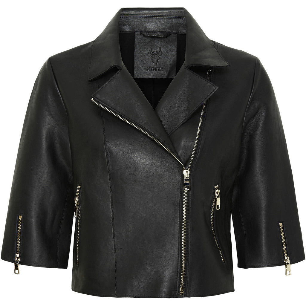 Kul, kort skinnjakke i det mykt lammeskinn. Jakken har korte ermer som er dekorert med glidelås nederst. Kan brukes med åpen krave eller lukket helt til. Skrå glidelås i venstre side. Fin å style over kjole eller topp.