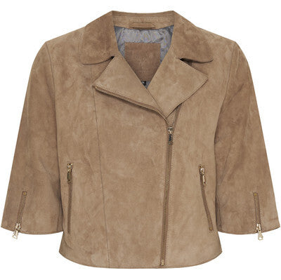 Kul, kort skinnjakke i semsket skinn. Jakken har 3/4 lange ermer med en liten light gold glidelås nederst. Kan brukes med åpen krave eller lukket helt til. Skrå glidelås i venstre side. Fin å style over kjole eller topp, en jakke du kan bruke til det meste!