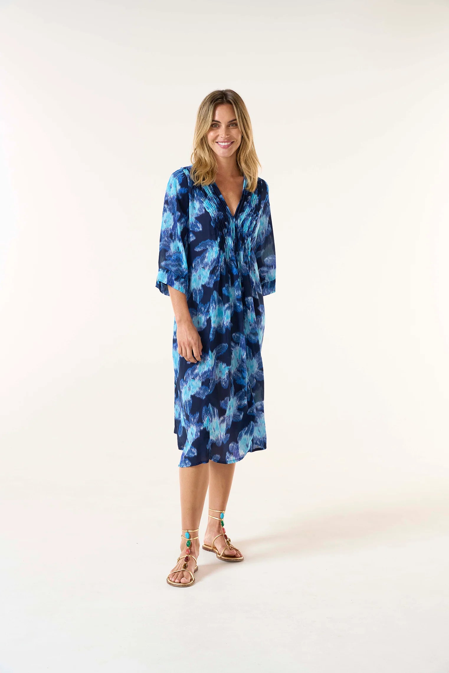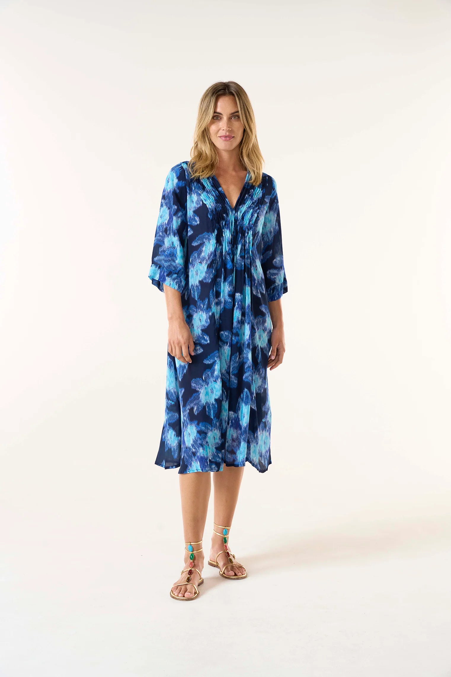 Nydelig kjole fra One Season i 100% viskose og lekre blå-toner! Den perfekte sommerkjole som henger løst og ledig langs kroppen, perfekt i varmen. Denne kjolen har V-hals, ¾ ermer og innsydde detaljer foran på bysten.