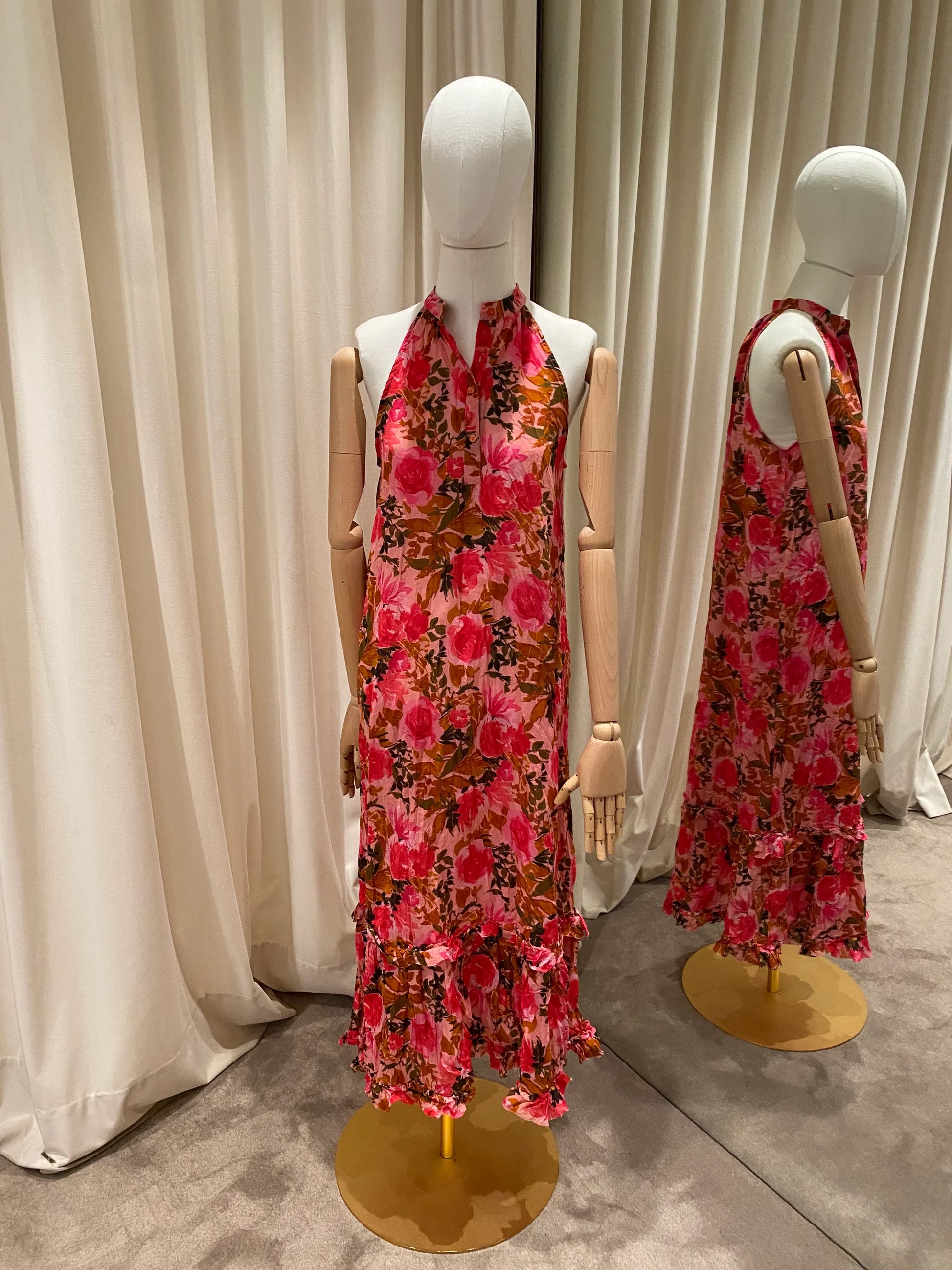 Den er laget i 100% vasket bomull, som er myk og behagelig mot huden, og den løse, midi passformen gjør at den sitter så flatterende på. Kjolen er ermeløs, har en halterneck hals og to delikate rysje-kanter på skjørtet , som gir kjolen det lille ekstra.