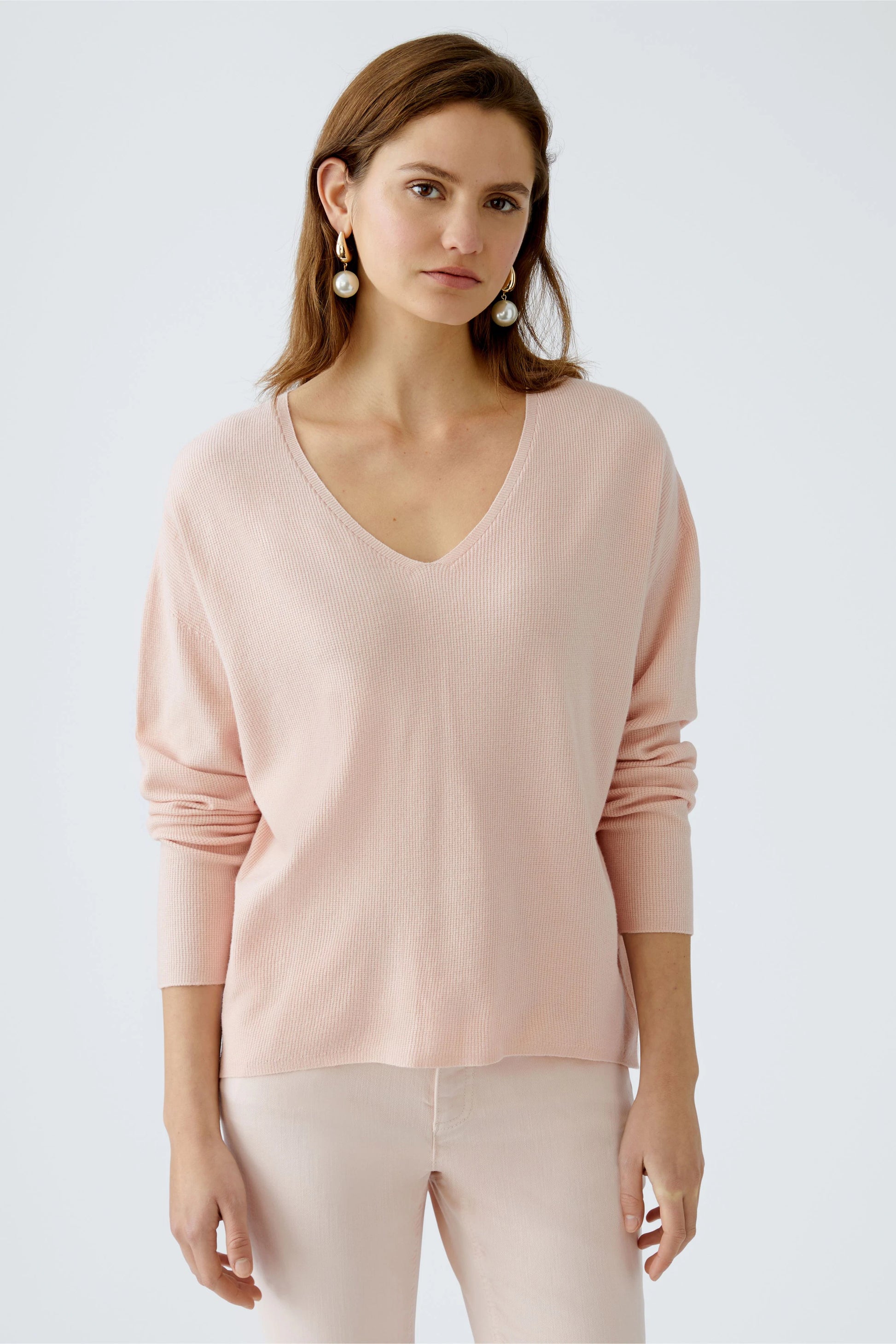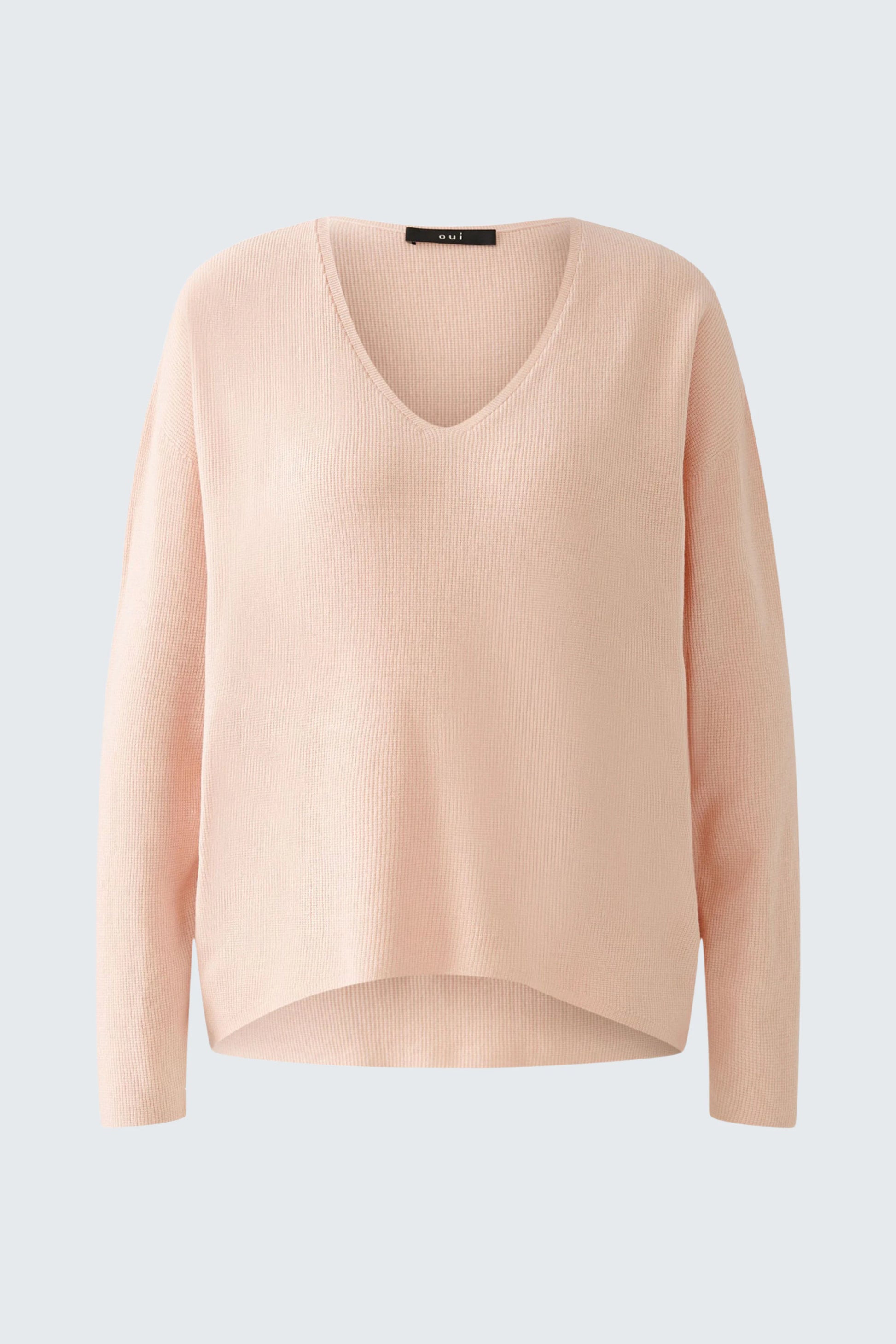 En enkel, lekker hverdags genser med v-hals fra Oui. Genseren er ribbestrikket i en viskose blend. Den har en litt oversized passform, noe som gjør at den ikke er helt ettersittende. En behagelig genser du kan bruke til jeans eller over kjole!