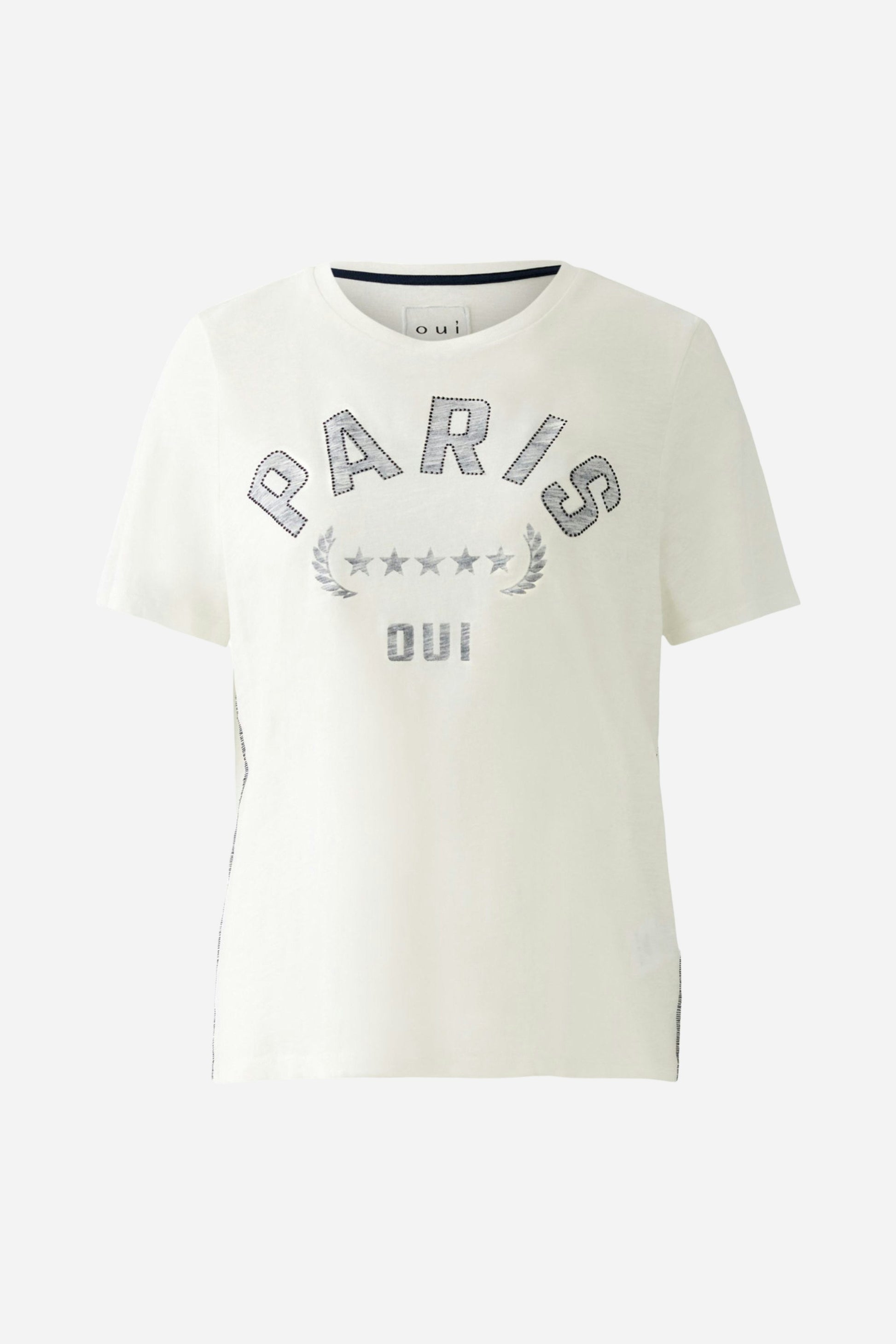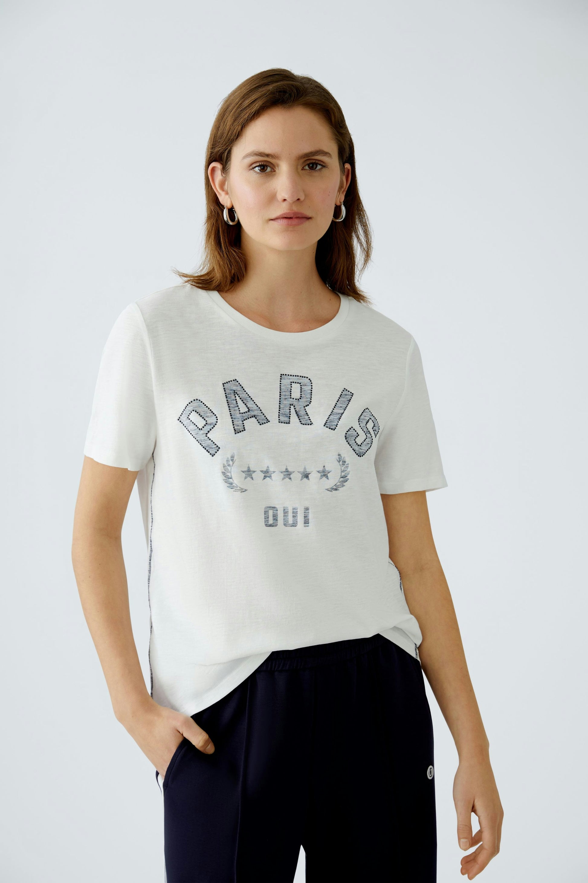 Lekker T shirt med rund hals og blå "fadet" skrift Paris med blå stener rundt, blå kontrast søm på siden som en fin detalj