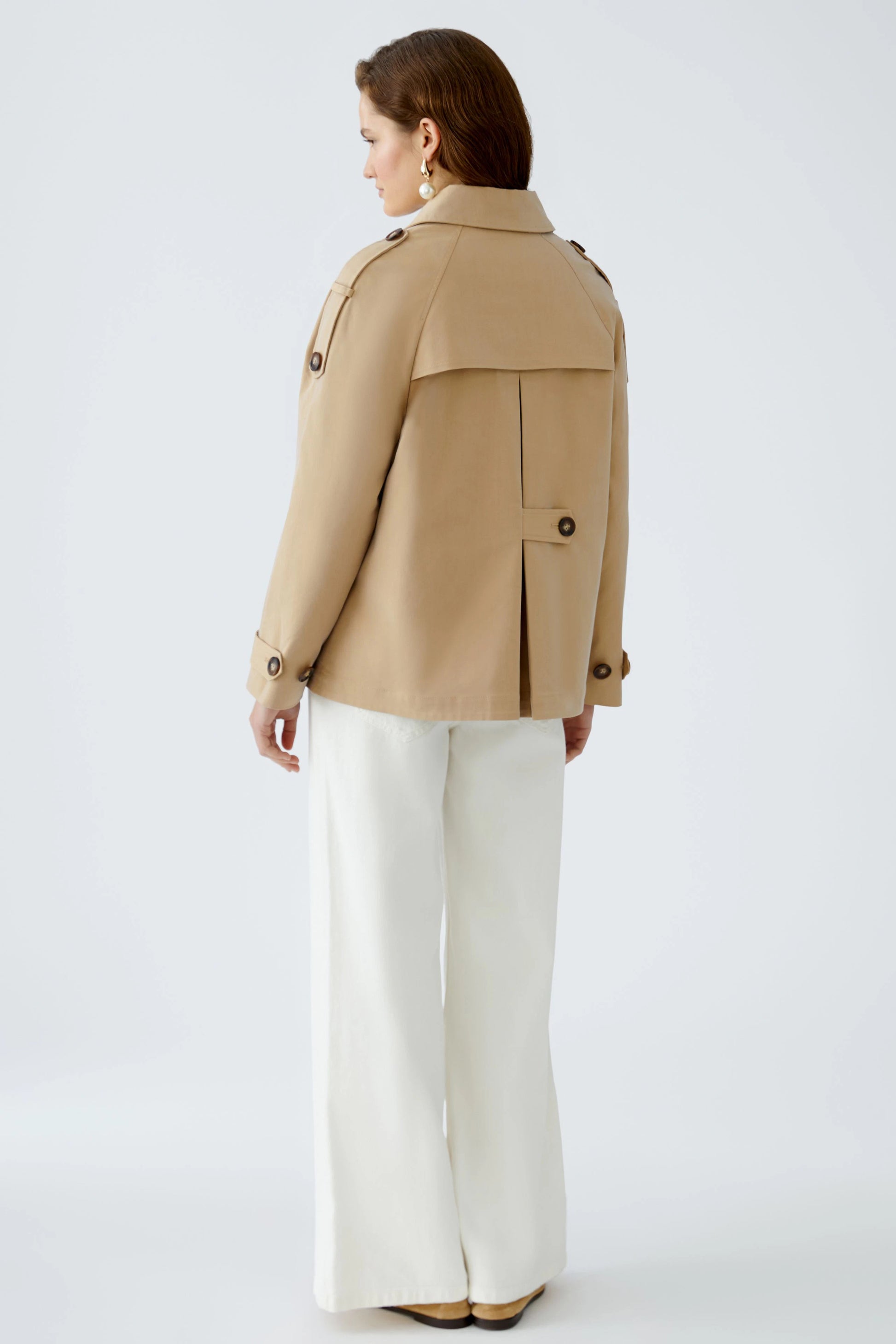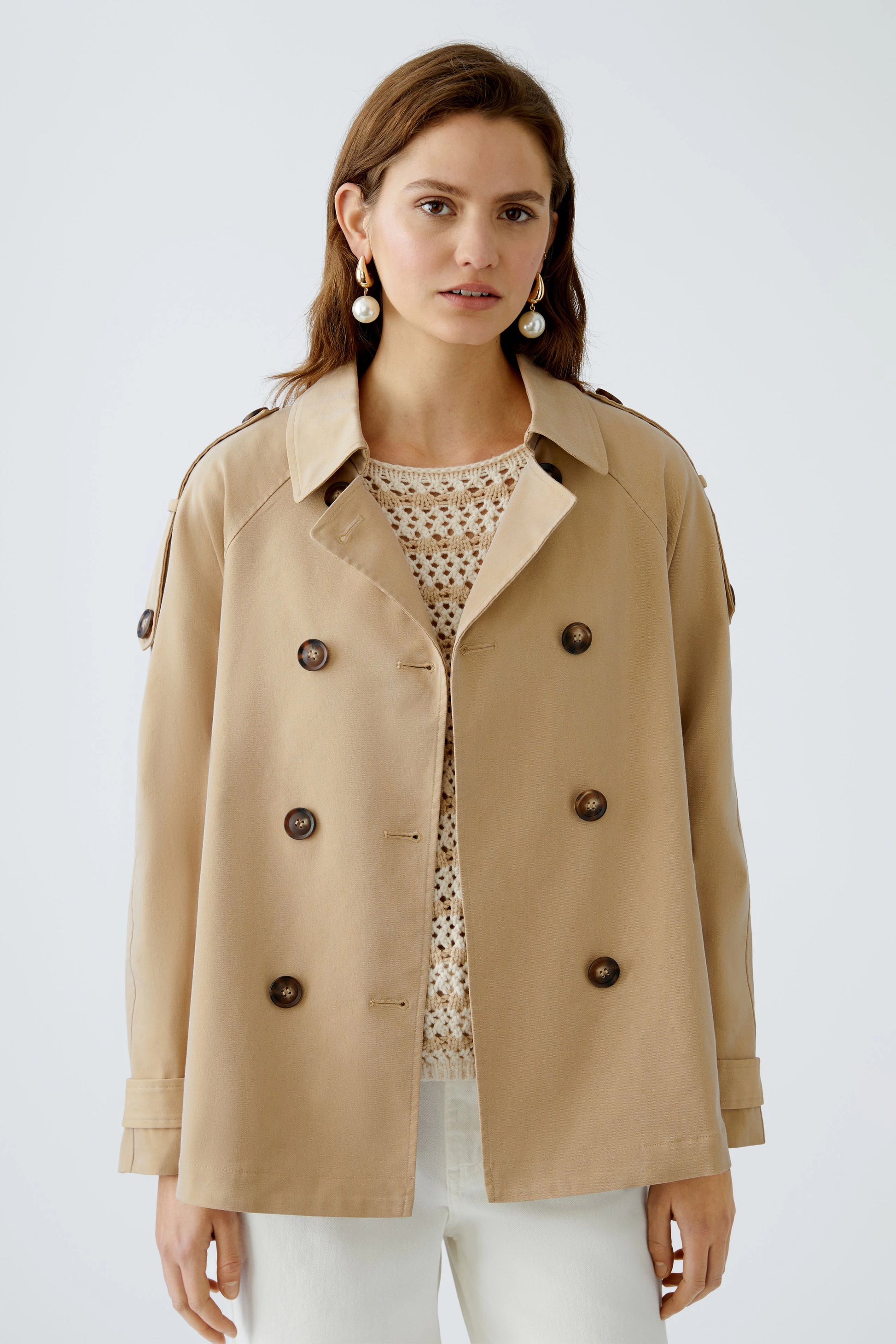 Denne lekre jakken fra Oui, en kort trenchcoat - passer perfekt utover våren! En stilig og klassisk jakke som passer til alt. Jakken har en A-fasong og lekre detaljer som doble knapper i front, knappe lukking bak på ryggen som kan åpnes for en mer "loos fit" og justering på ermer.