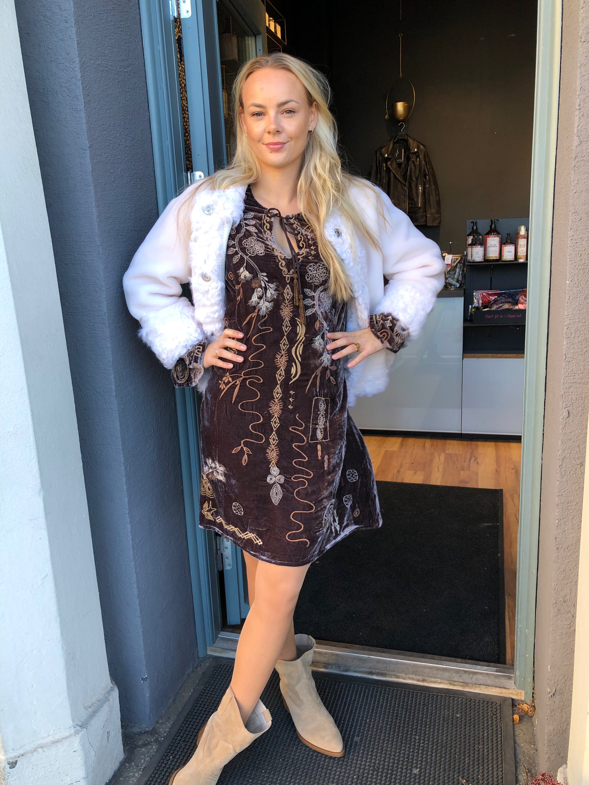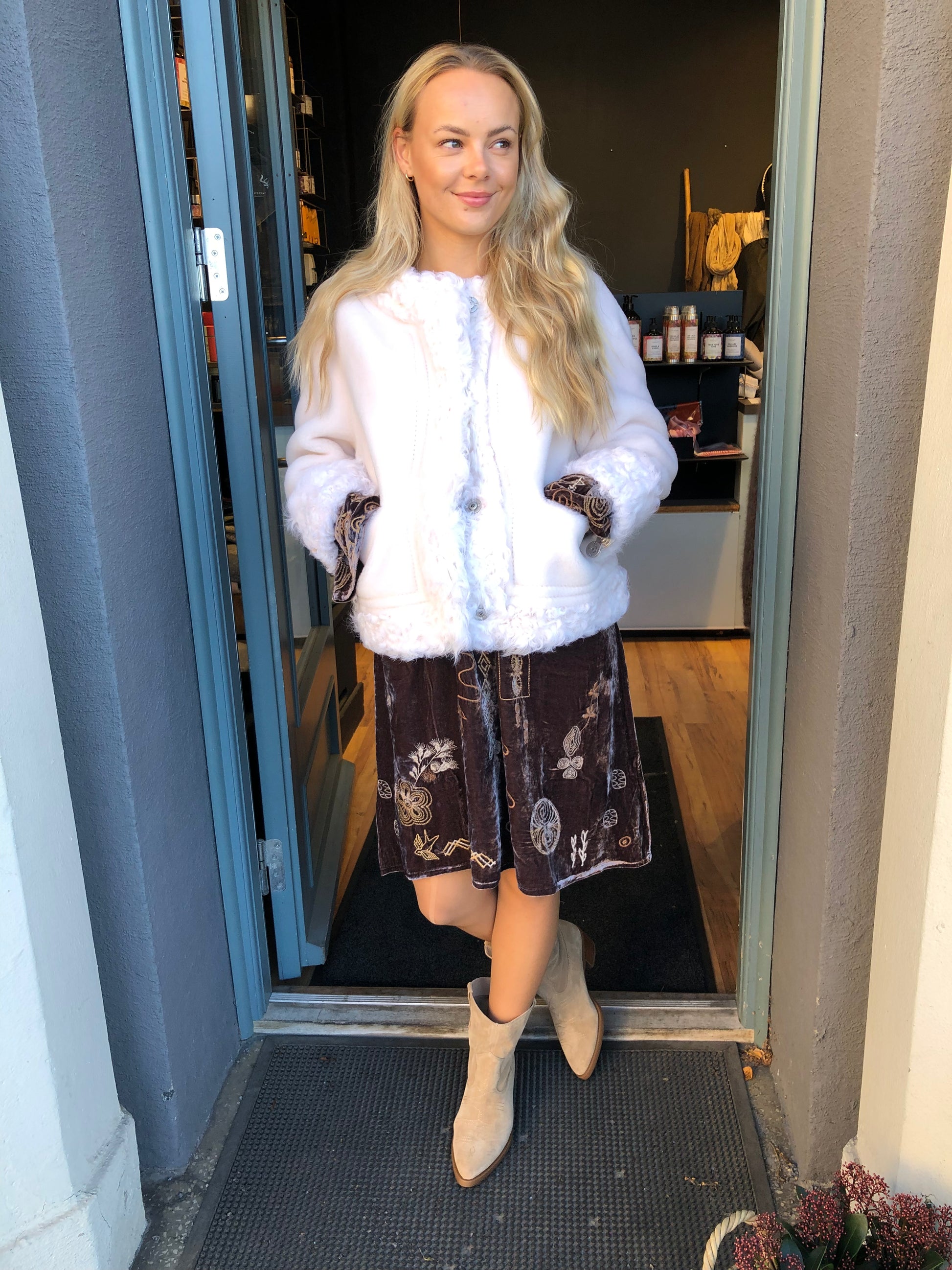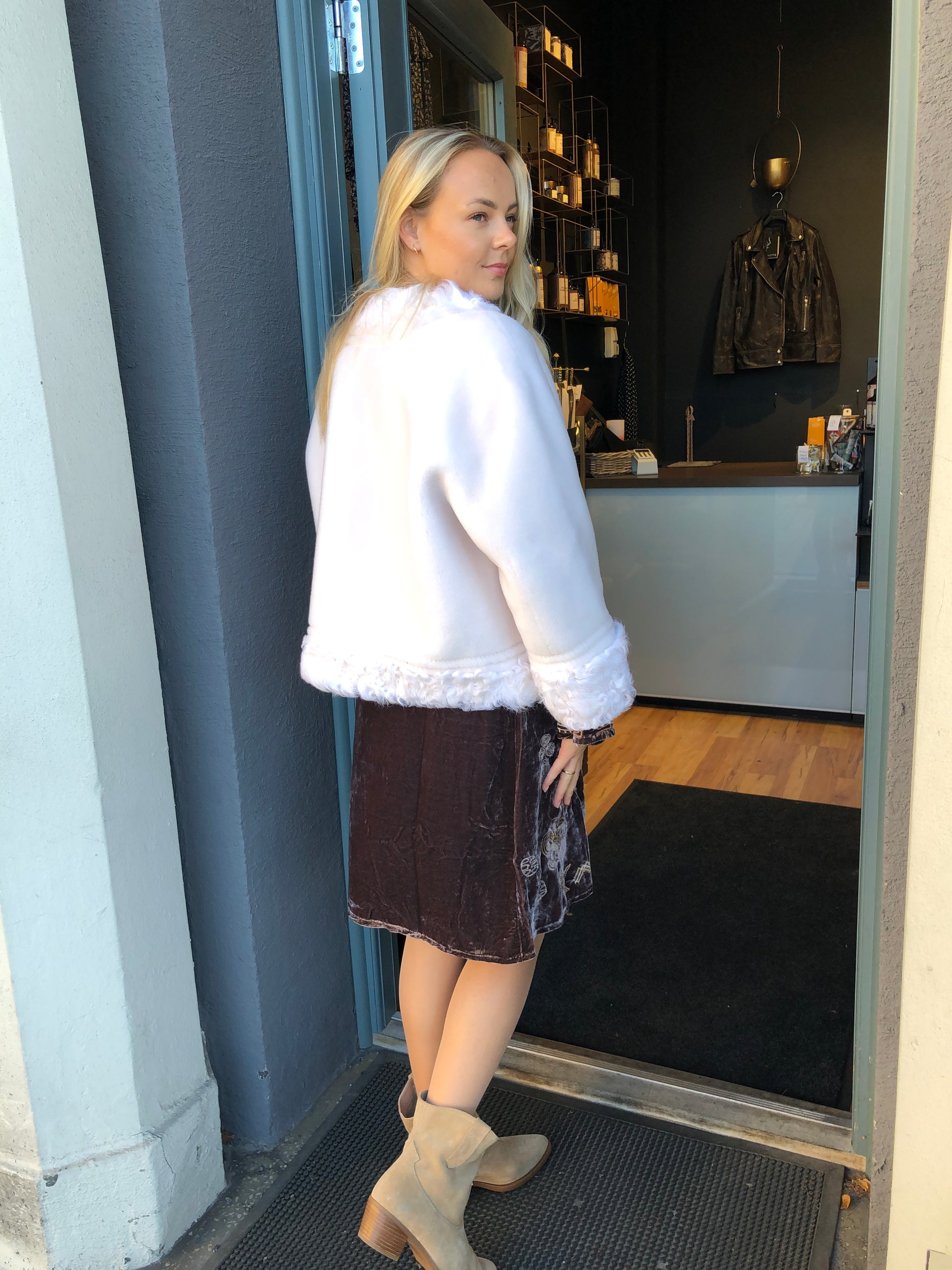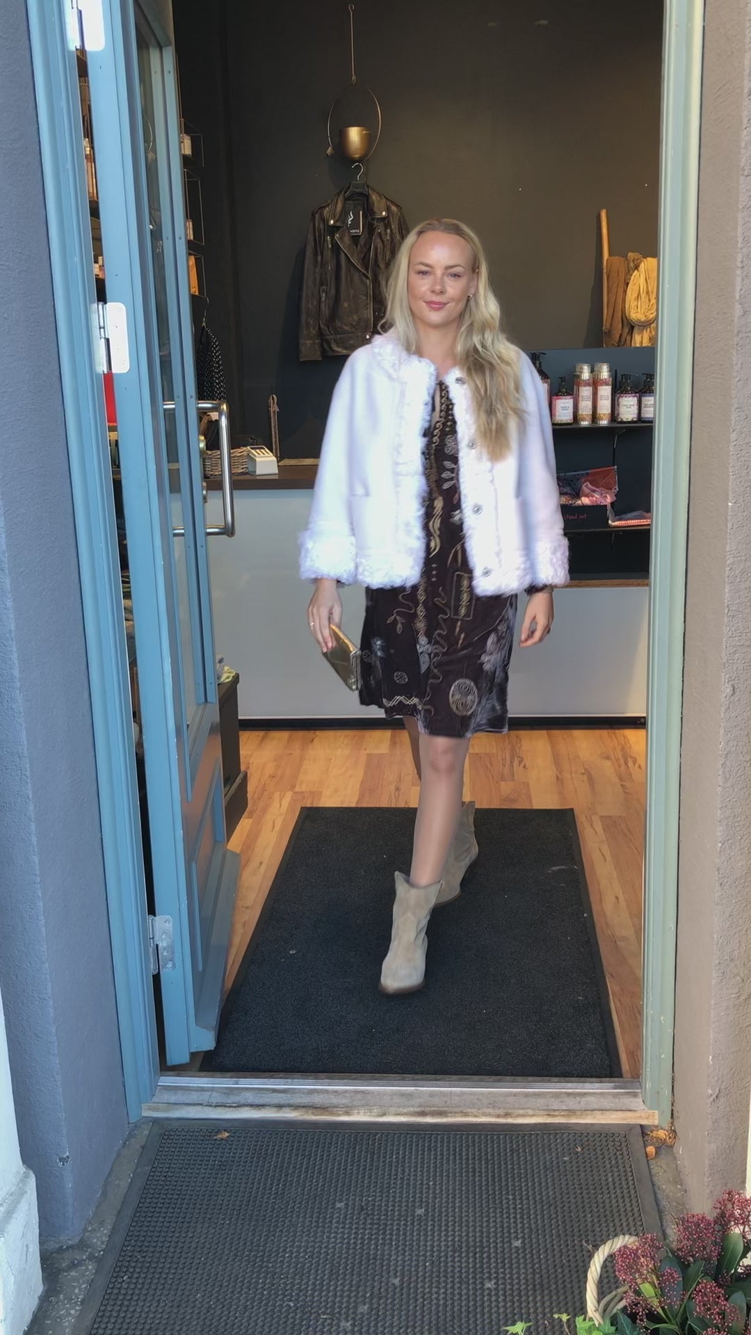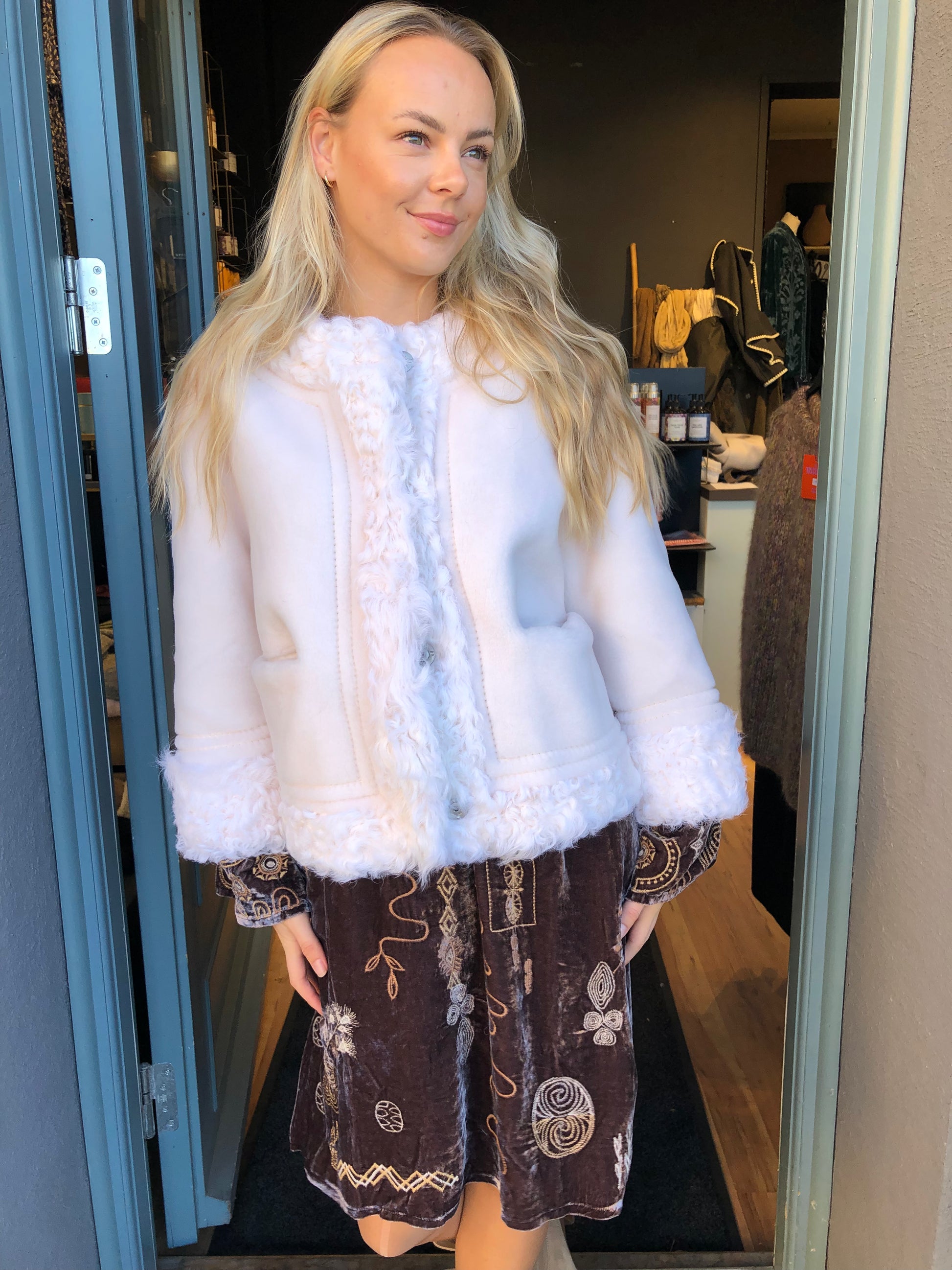 Rålekker kort vendbar jakke i 100% lammeull på den ene siden og vegansk skinn på den andre siden.7/8 dels lengde på armen, lommer i siden og lukkes med knapper. Sesongens må ha jakke som hever etterhvert antrekk!