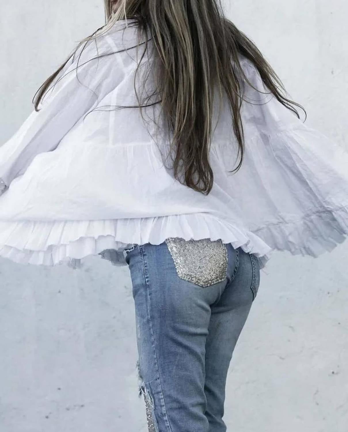 Kul Jeans fra Sixtydays med gullpaljetter foran og på lomme med slitte detaljer